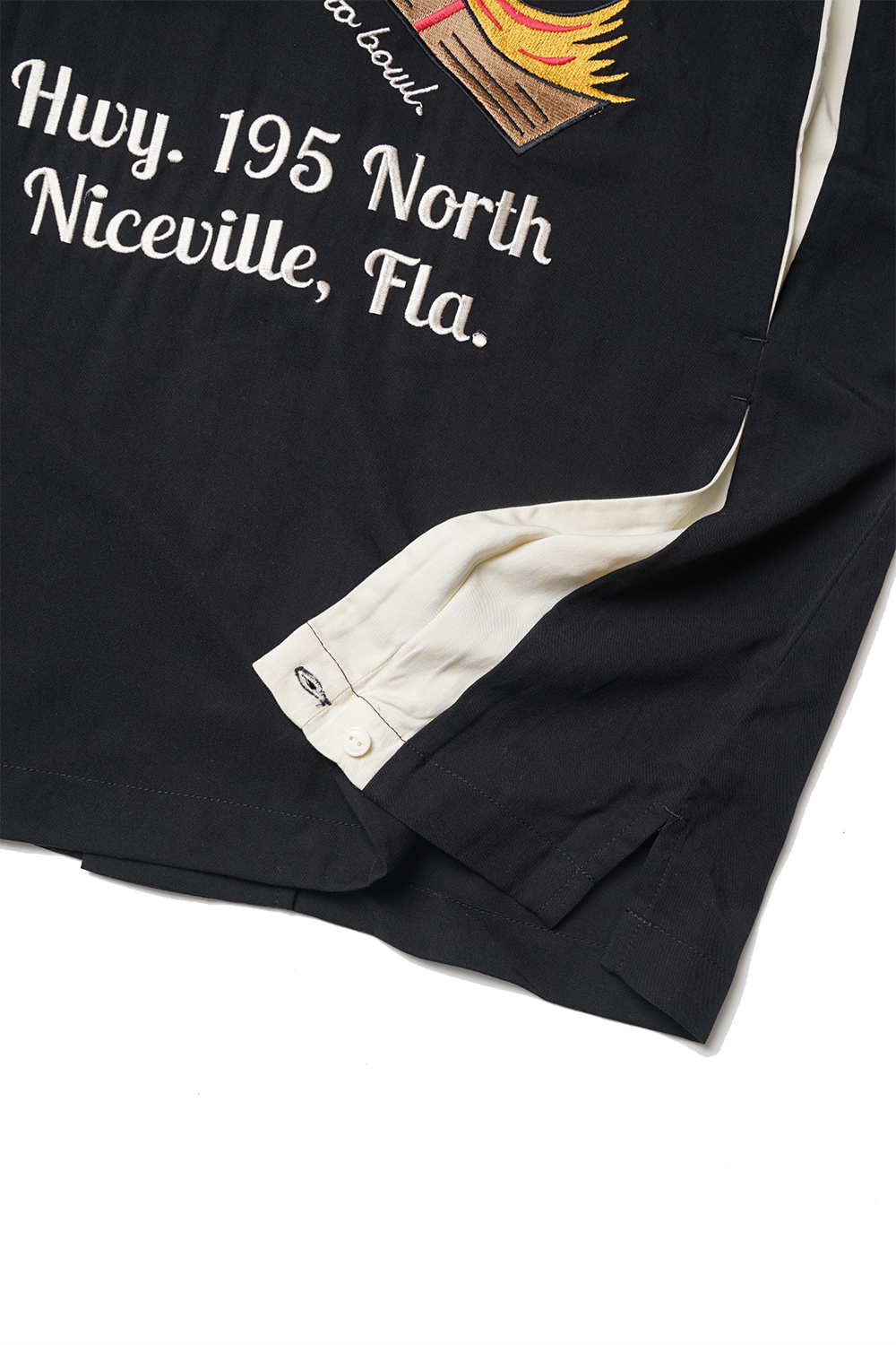 Houston Japan 41081 Bowling Shirt (Fighter Aircraft) - Black 휴스턴 재팬의 썸머 스테디 셀러 아이템 '볼링 셔츠'입니다. 소재는 레이온을 사용하여, 부드러우면서도 은은한 광택이 특징입니다. 목 부분은 오픈카라 형태이며, 포켓의 상단에는 네임자수가 놓여있습니다. 프론트에는 볼링핀 디자인의 유니크한 버튼을 채택하였습니다. 후면부의 양측으로는 버튼으로 개폐가 가능한 액션 플리츠가 있어, 활동성에 용이합니다. 또한 후면부의 중앙에는 클래식하면서도 팝적인 전투기 일러스트가 디자인 되어있습니다.