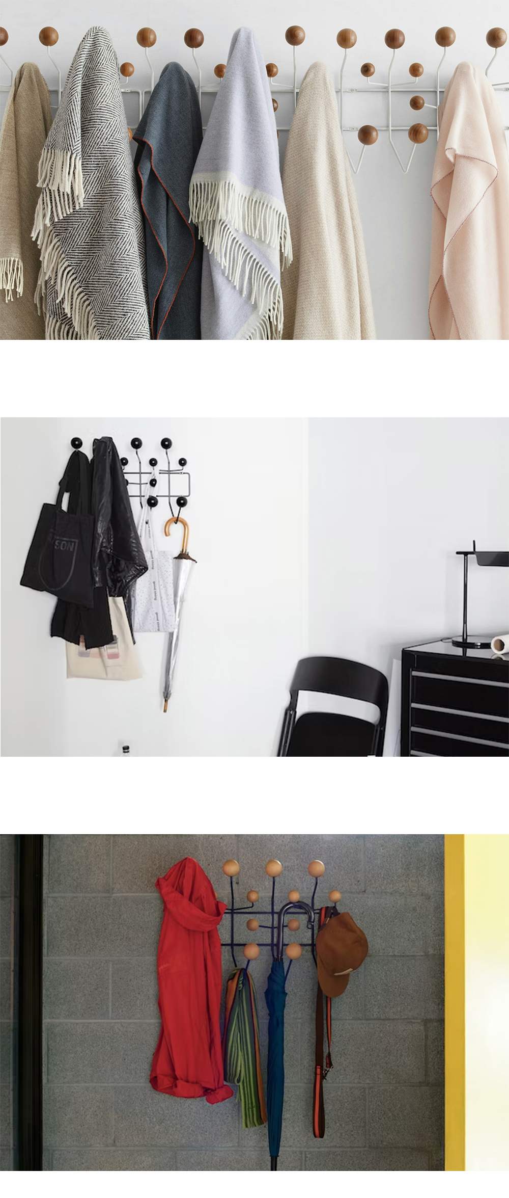 1953년 찰스&레이 임스 부부가 디자인한 행잇올은 이름 그대로 모든 것을 걸어놓도록 제작된 벽걸이형 옷걸이입니다. 기본 기능에 충실하면서도 매력적인 디자인으로, 처음에는 어린이들을 위해 디자인 되었으나 지금은 세대를 아우르며 사랑받는 아이템이 되었습니다. 공간의 분위기를 화사하게 바꿔주며 포인트를 주는 오브제로도 활용하기 좋습니다.