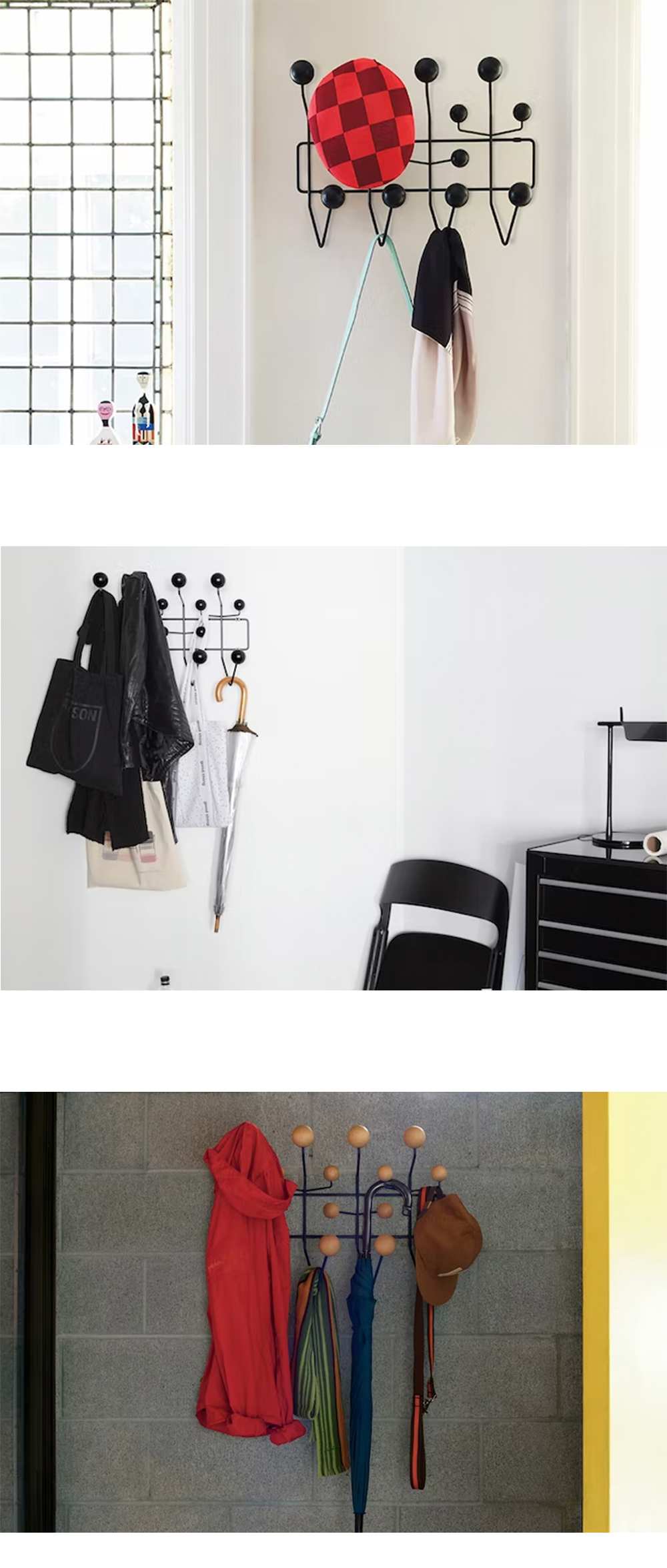 1953년 찰스&레이 임스 부부가 디자인한 행잇올은 이름 그대로 모든 것을 걸어놓도록 제작된 벽걸이형 옷걸이입니다. 기본 기능에 충실하면서도 매력적인 디자인으로, 처음에는 어린이들을 위해 디자인 되었으나 지금은 세대를 아우르며 사랑받는 아이템이 되었습니다. 공간의 분위기를 화사하게 바꿔주며 포인트를 주는 오브제로도 활용하기 좋습니다.