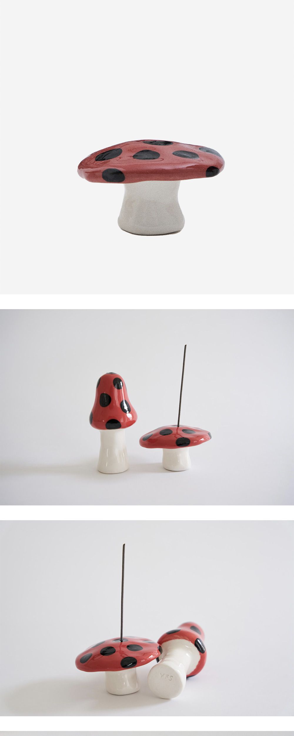 버섯 형태의 핸드 크래프트 인센스 홀더입니다. 상단부분 인센스 스틱을 고정할 수 있는 홀이 있으며 오브제로도 활용 가능합니다. 세라믹 아티스트의 손길로 빚어진 각 제품들은 불규칙한 고유의 형태를 이루고 있습니다. 담금 방식이 아닌 수작업 채색 방식으로 자연스러운 수채화 느낌을 담고 있습니다.