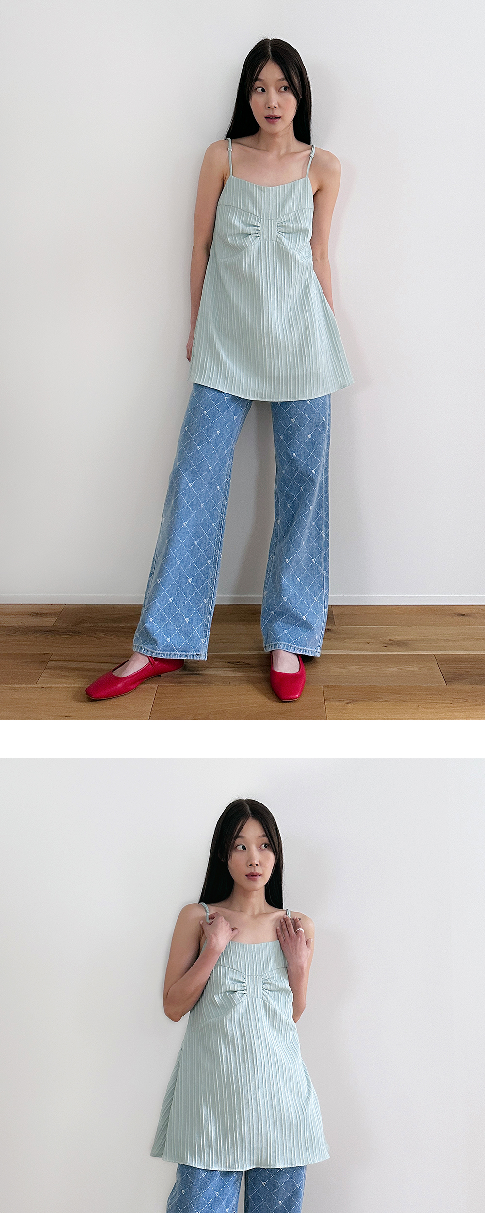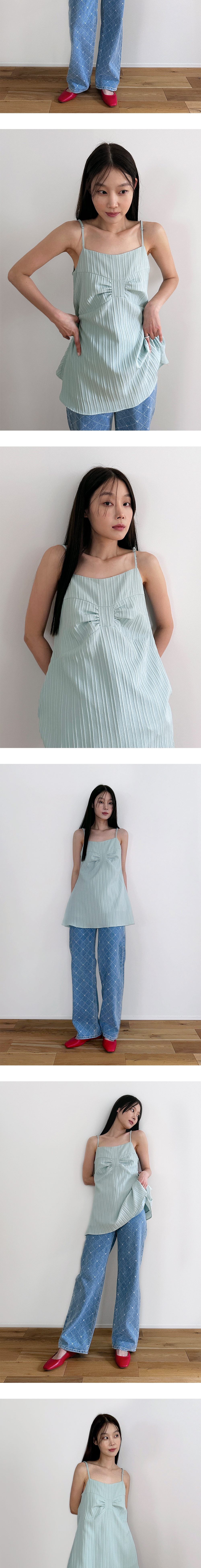Margarin fingers 24 mid 블루밍 리본 원피스입니다. - 은은한 광택이 도는 스트라이프 패턴의 자수 소재 - 러프하게 떨어지는 A 라인 미니 슬립 원피스 - 리본 모양의 가슴 디테일 - 사이즈 조절 팁으로 어깨끈 길이 조절 가능