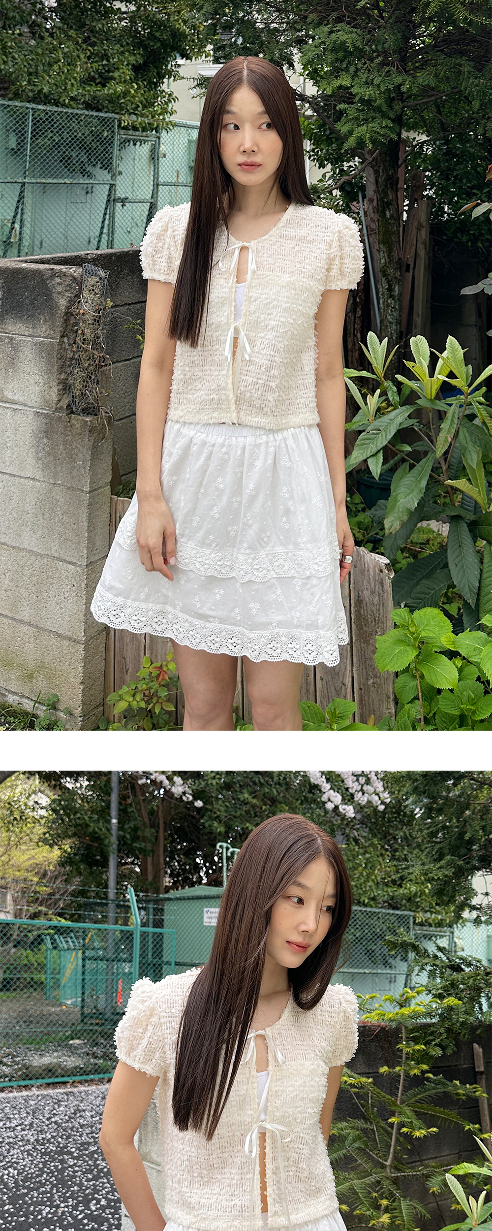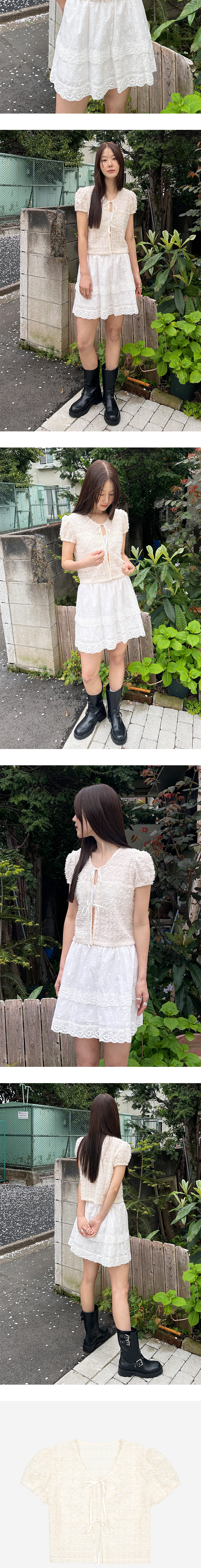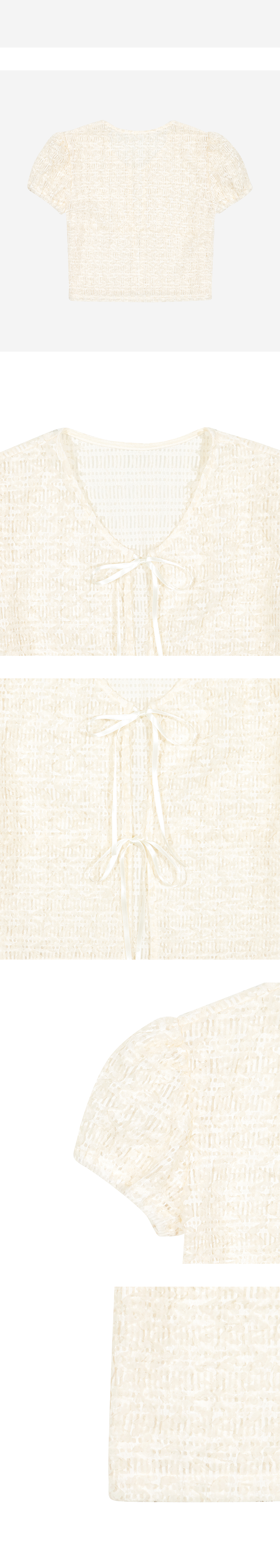 Margarin fingers 24 mid 블랑 블라우스입니다. - 꽃 패턴의 자수레이스 원단 - 소매 퍼프와 리본 끈 디테일을 더해 러블리한 무드 연출 - 소매입구 전체 밴드 * 원단 전체가 자수로 되어있기 때문에 날카로운 곳에 걸리지 않도록 유의해 주시길 바랍니다. * 위 사유로 원단에 손상이 생길 경우 AS가 불가합니다.