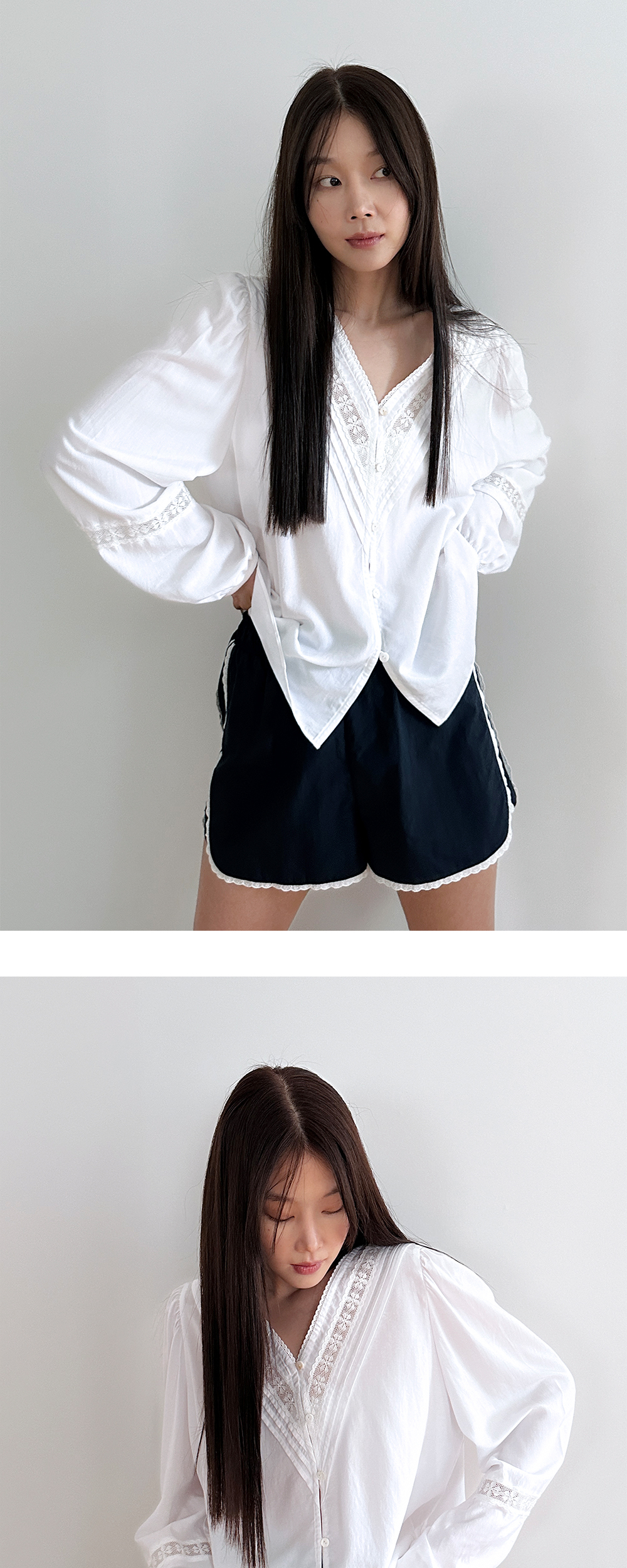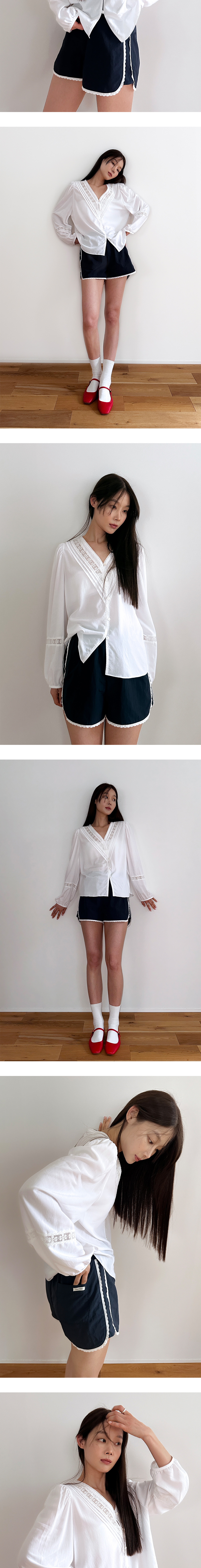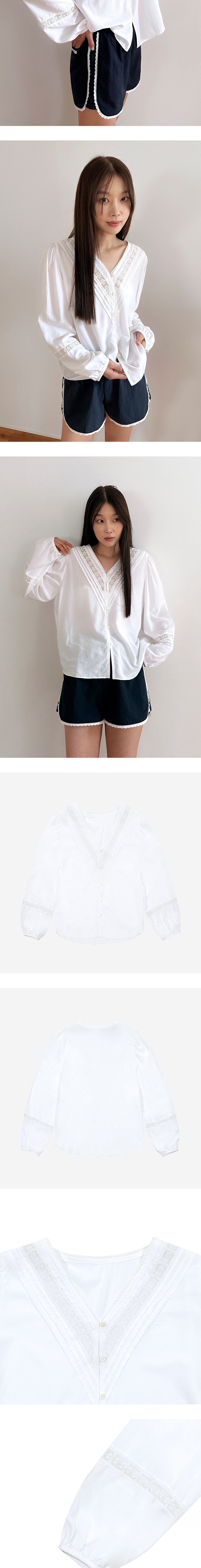 Margarin fingers 24 mid 브이넥 레이스 블라우스입니다. - 레이온, 텐셀 혼방소재로 부드러운 텍스처의 루즈 핏 블라우스 - 브이 넥 라인을 따라 사선 핀턱과 레이스 트리밍 디테일 - 콩알 단추와 단추고리 여밈