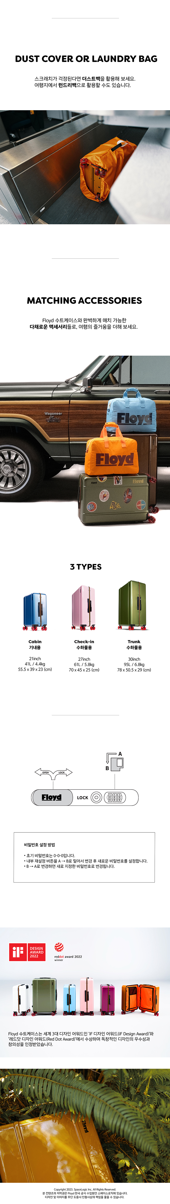 플로이드는 1970년대 캘리포니아의 스케이트 보드 문화와 베니스 비치에서 영감을 받아 2019년 탄생한 독일 브랜드입니다. 분실 걱정 없는 어디서나 한 눈에 띄는 11가지의 아이코닉한 컬러, 취향에 따라 손쉽게 교체할 수 있는 13가지 컬러의 바퀴 옵션, 수트 케이스와 매칭 가능한 감각적인 액세서리, 더불어 최고의 품질과 수납력까지. 모든 여행자들에게 충분한 만족감을 선사합니다.
