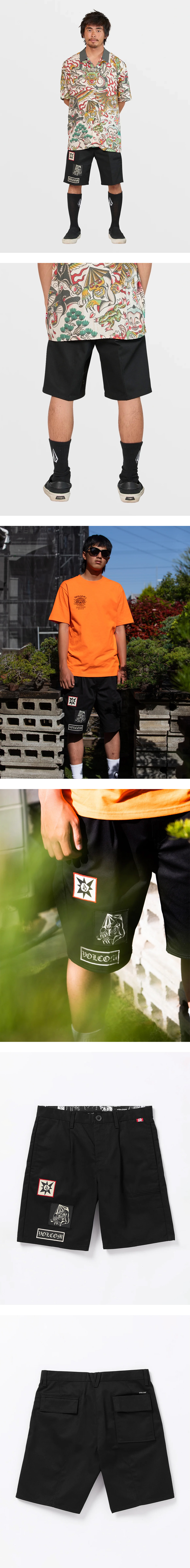 타투 아티스트 하마모토 유스케 콜라보 제품 20인치 아웃심(9.25인치 인심) - 32 사이즈 기준 가벼운 DWR 코팅으로 생활 오염 방지 앞면 플리츠가 있는 여유운 핏의 치노 스타일 내부 허리 밴드와 주머니감 전면 프린트 디테일 옆면 싱글 웰트 포켓과, 다리쪽 웰트 포켓 디자인 면 트윌 소재 위에 프린트가 된 패치를 활용한 시그니처 아트웍 디자인 뒷면 포켓 플랩 엔트리가 있는 이중 패치 포켓