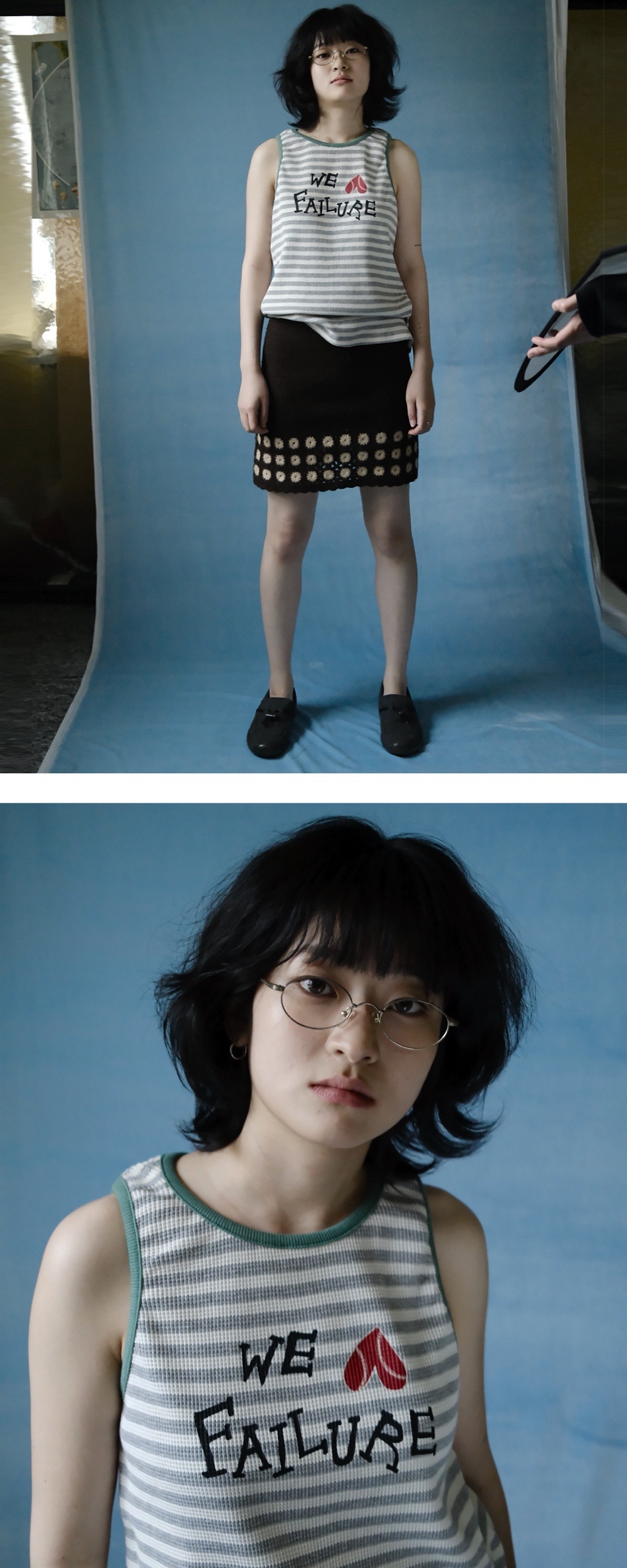 * 해당 상품은 '예약 배송' 상품으로, 5/17부터 순차 출고 예정입니다. Cotton 100% 스트라이프 와플 원단 텐타 워싱 앞판 나염 아트워크 초록색 배색 랍빠 디테일 *Model 1: 160cm, 43kg, 24inch