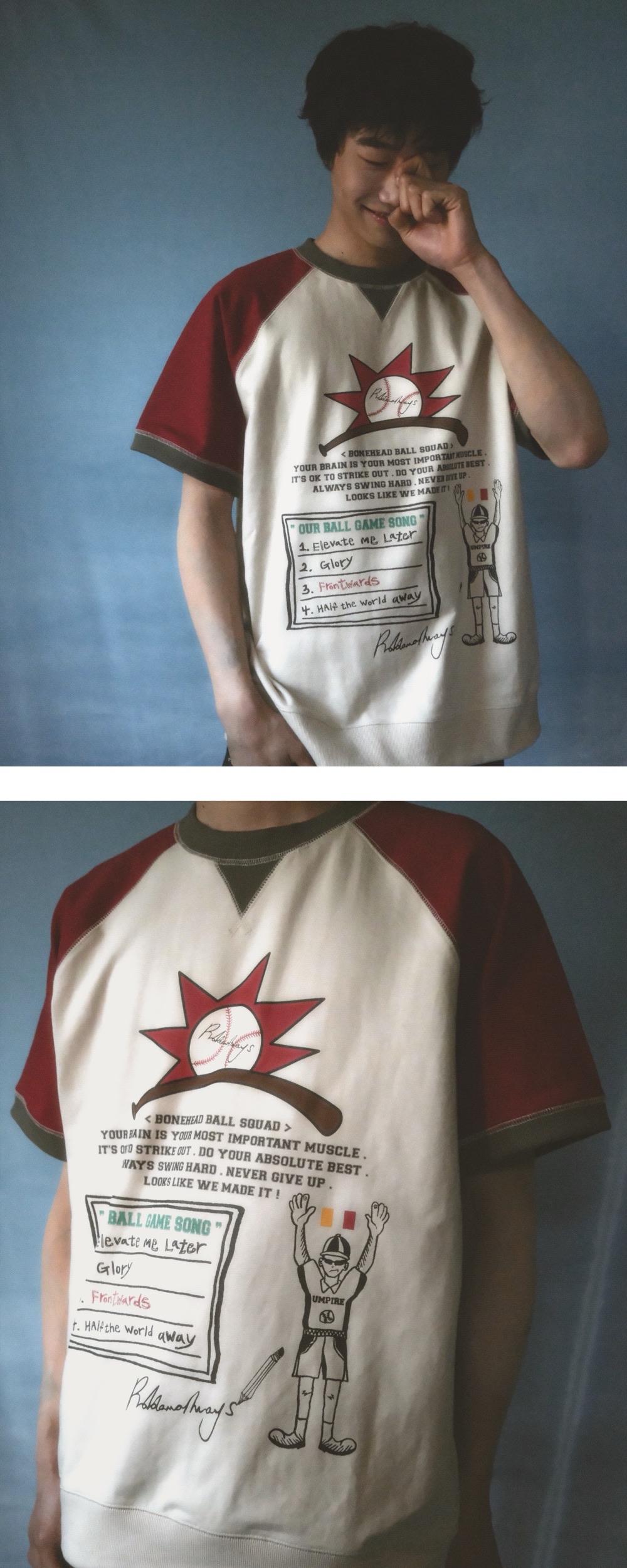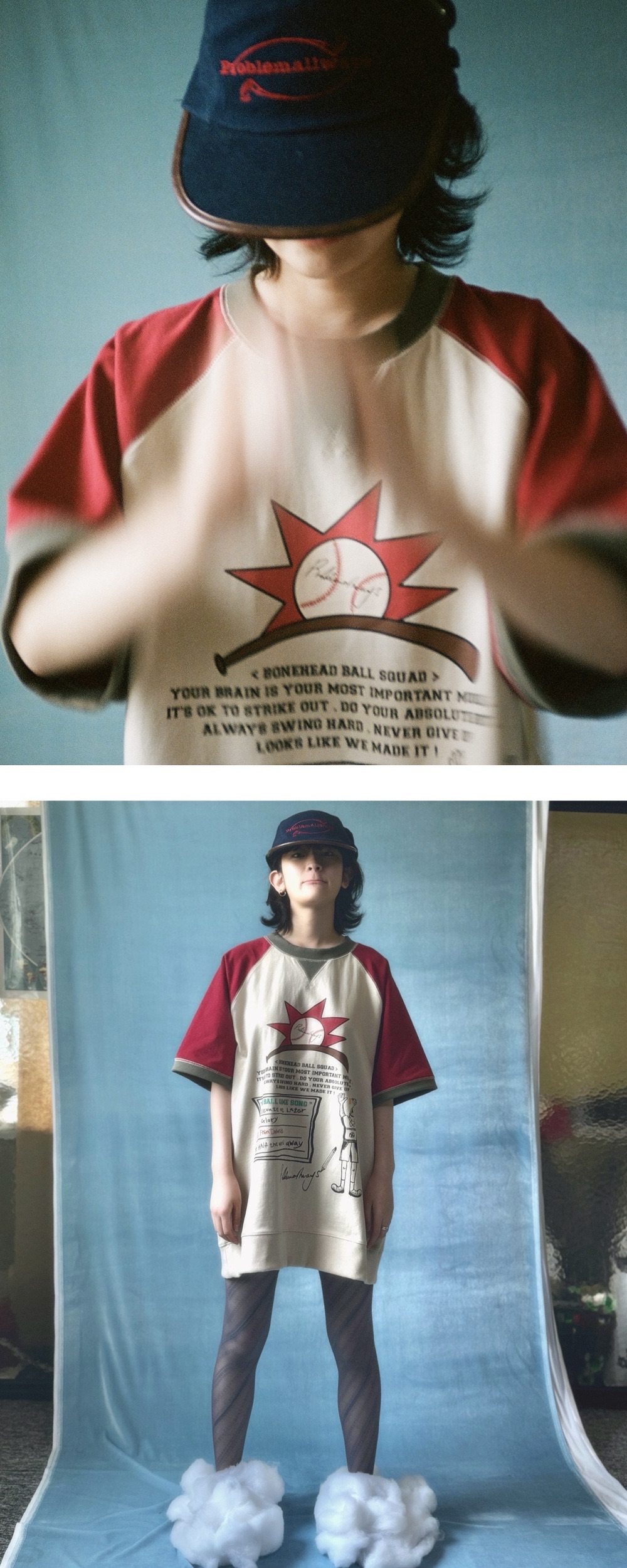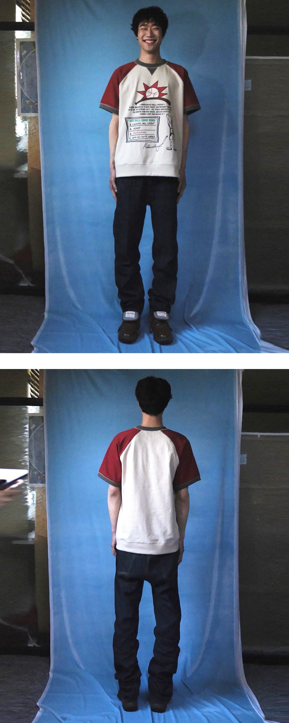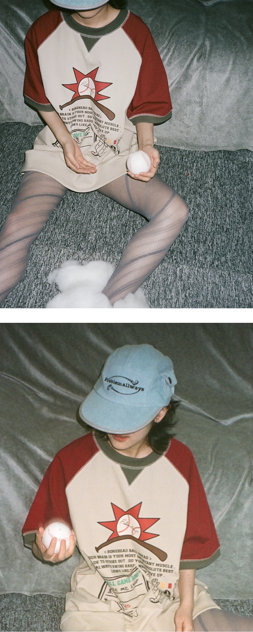 Cotton 85%+Polyester 10%+Span 5% 오버사이즈 배색 반팔 스웨트셔츠 앞판 나염 아트워크 앞판 가이루빠 봉제 디테일 *Model 1: 160cm, 43kg, 24inch *Model 2: 184cm, 70kg, 26inch