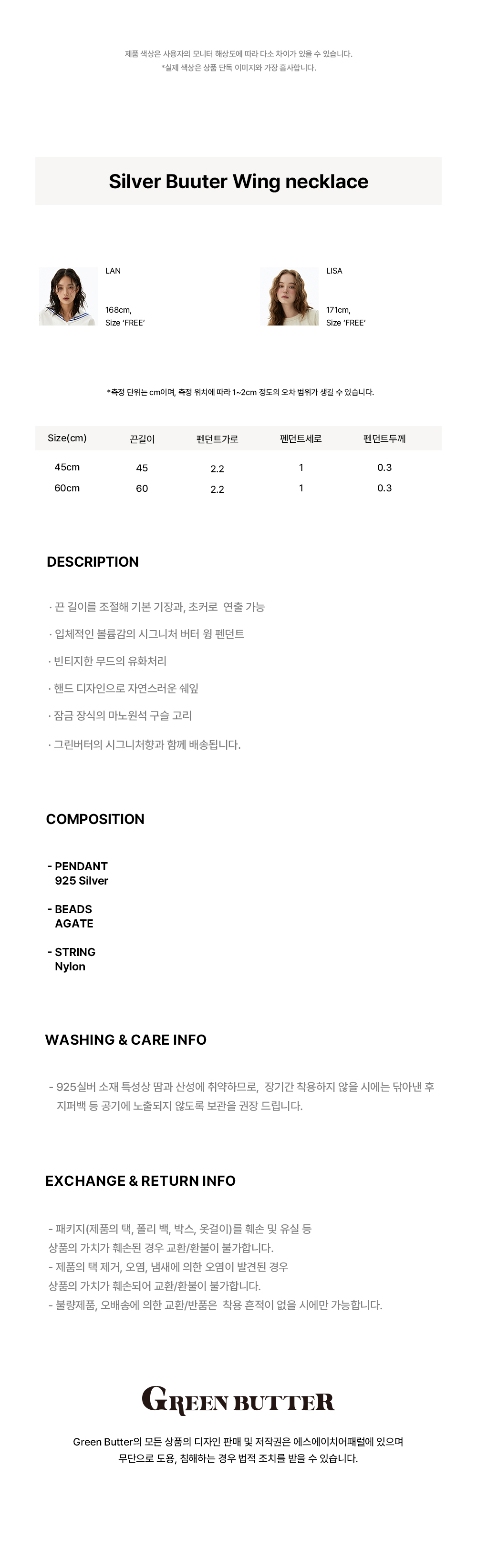 _끈 길이를 조절해 기본 기장과, 초커로 연출 가능_입체적인 볼륨감의 시그니처 버터 윙 펜던트_빈티지한 무드의 유화처리_핸드 디자인으로 자연스러운 쉐잎_잠금 장식의 마노원석 구슬 고리_그린버터의 시그니처향과 함께 배송됩니다.