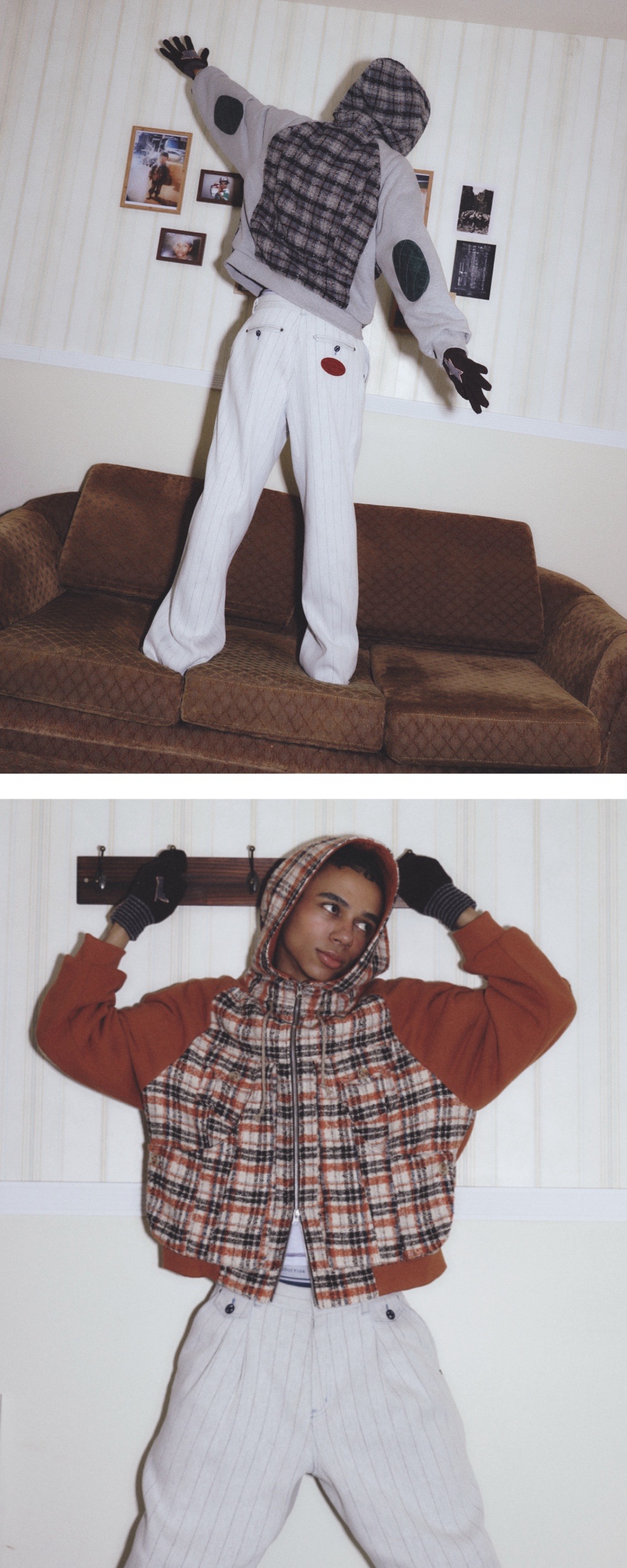 Cotton 60%+Polyester 40% 아버지가 물려주신 정장 바지에서 영감을 받은 데님 팬츠 세미 와이드핏 팬츠 앞판 빈티지 흔들이 단추 앞판 페이크 포켓 디테일 앞, 뒤판 체크 단추와 리벳 뒤판 가죽 라벨 밑단 올풀림 데끼 처리 YKK 지퍼 *Model: 184cm, 68kg