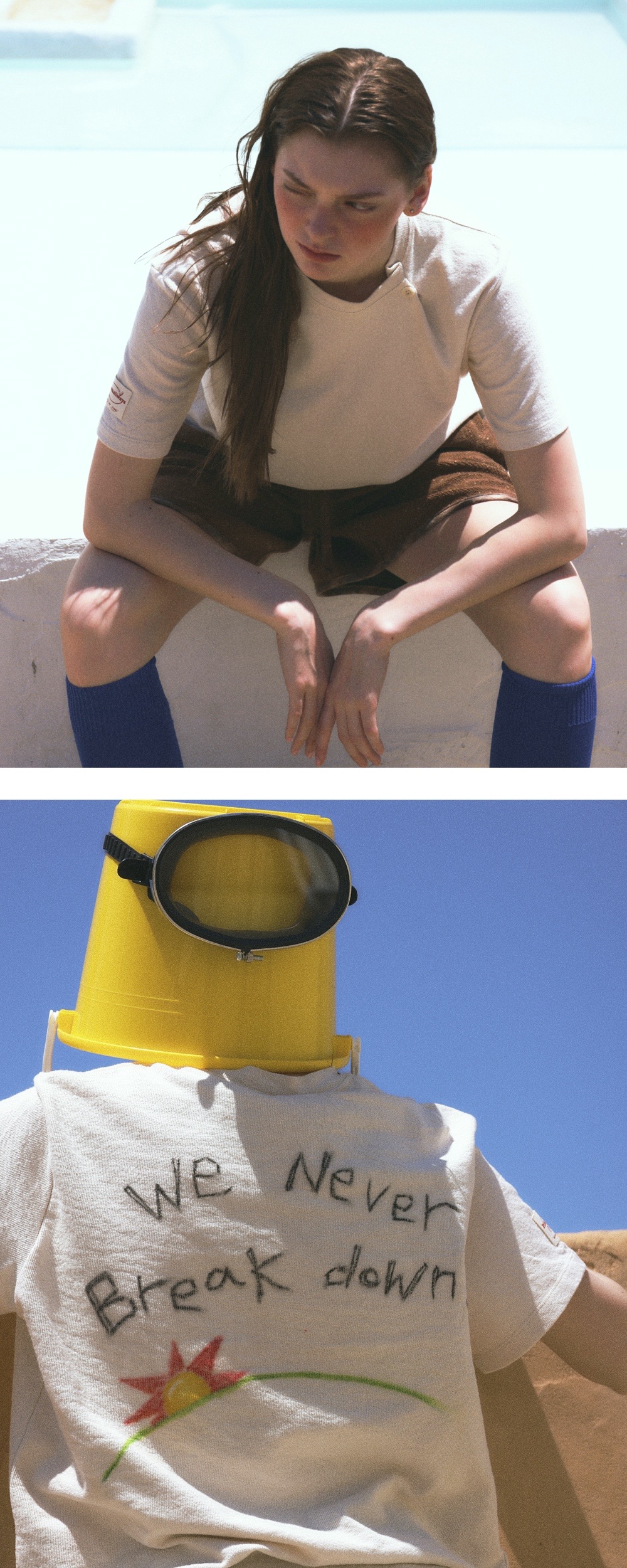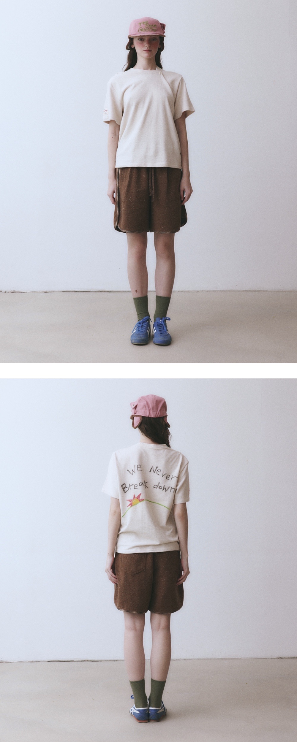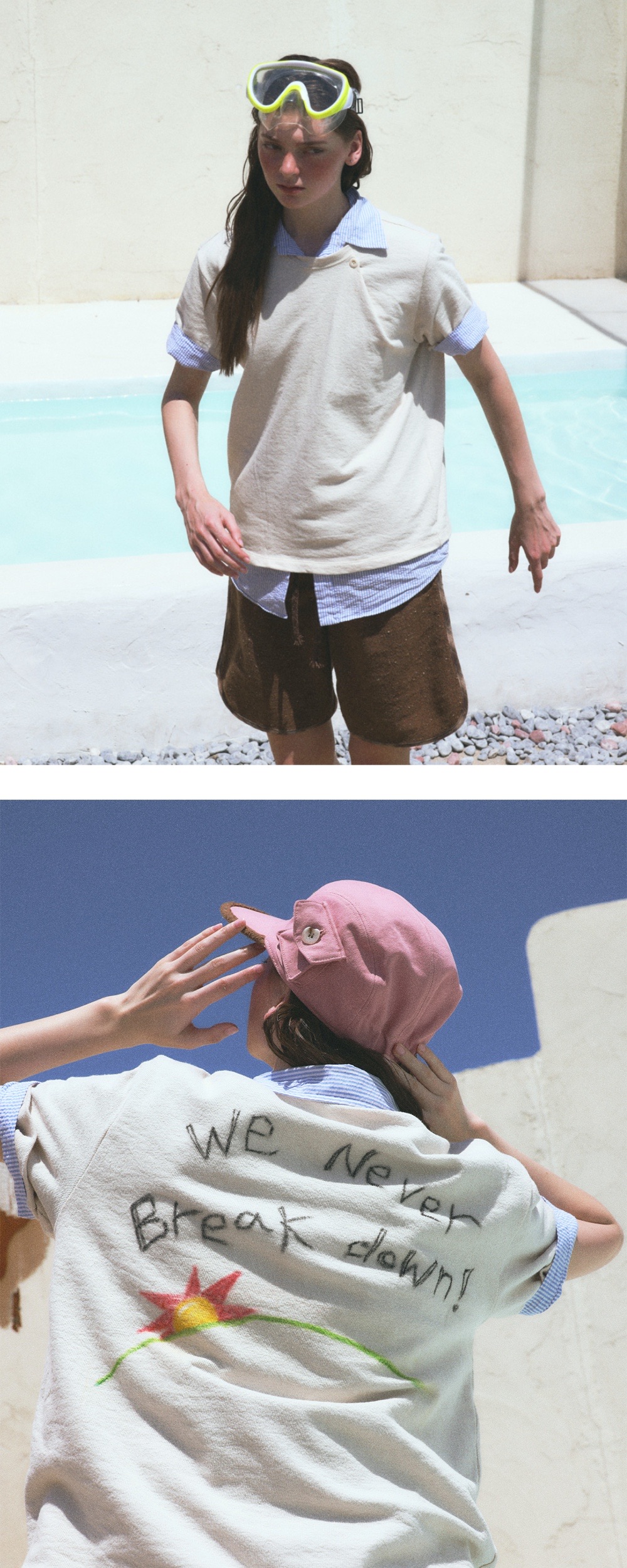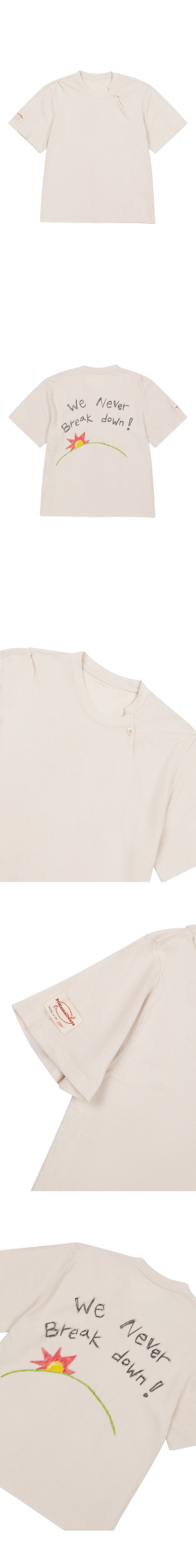 Cotton 100% 세미 오버핏 반팔 티셔츠 넥 라인 턱과 페이크 단추 디테일 오른쪽 어깨 턱 디테일 오른쪽 소매 중앙 라벨 넥 라인 갈라삼봉 숄더 체인스티치 뒤판 패브릭 크레용을 활용한 핸드메이드 아트워크 (패브릭 크레용 특성상 반복적인 세탁시, 점점 옅어질 수 있음) *Model: 173cm, 23.5inch