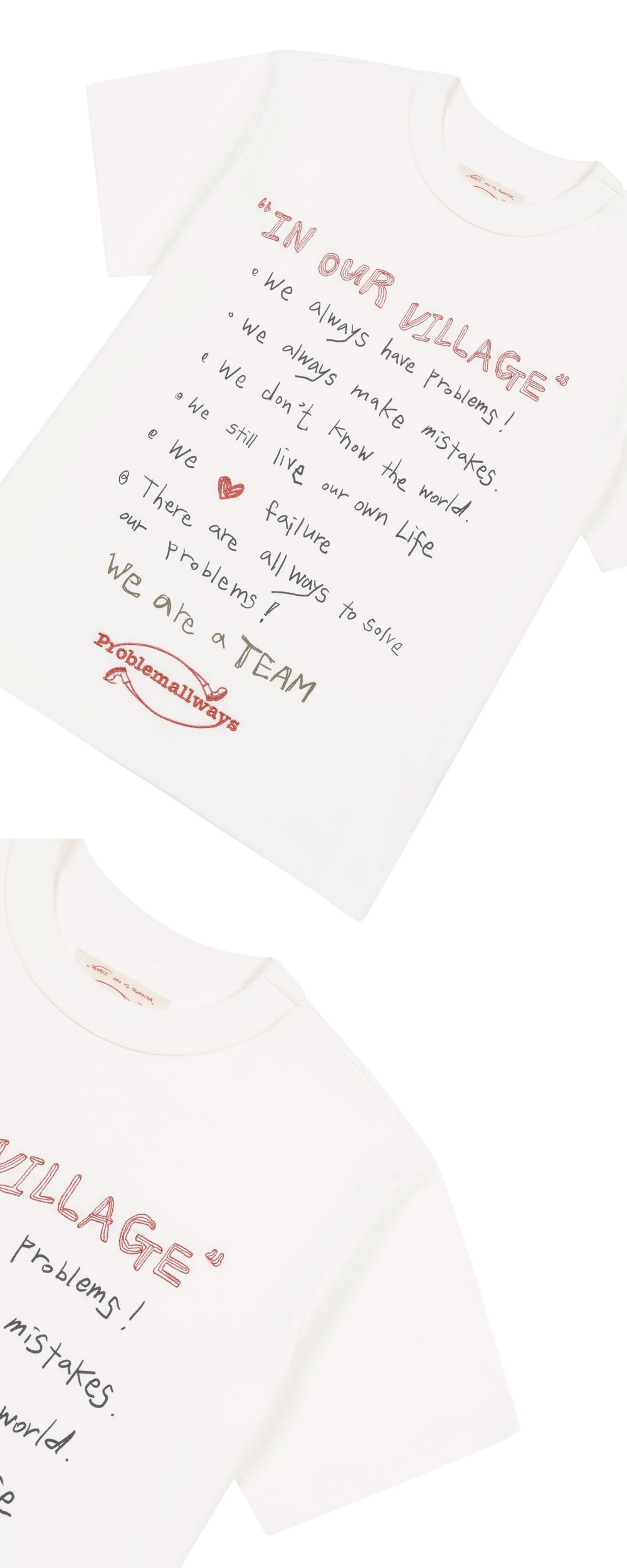 Cotton 100% 20수 바이오 싱글 원단 텐타덤블 워싱 앞판 나염 아트워크 IN OUR VILLAGE 도트 자수 하트와 로고 사틴 자수 고밀도 하이게이지 편직으로 세탁 내구성 강화 *낮은 온도의 물세탁 후 자연 건조 권장