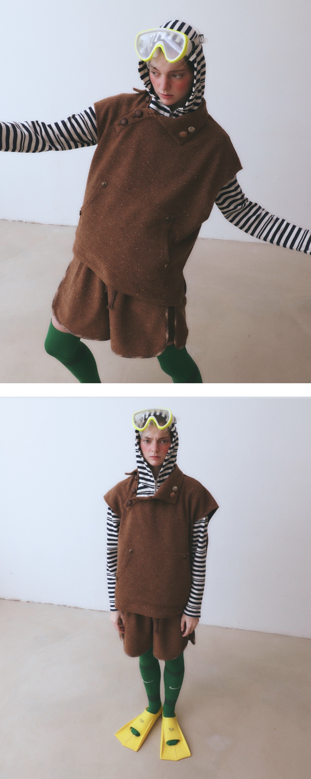 Wool 60%+Polyester 40% 세미 오버핏 베스트 언밸런스 칼라 앞판 캥거루 포켓 포켓 단추 로고 디테일 뒷판 레터링 사틴 자수 *Model: 173cm, 23.5inch