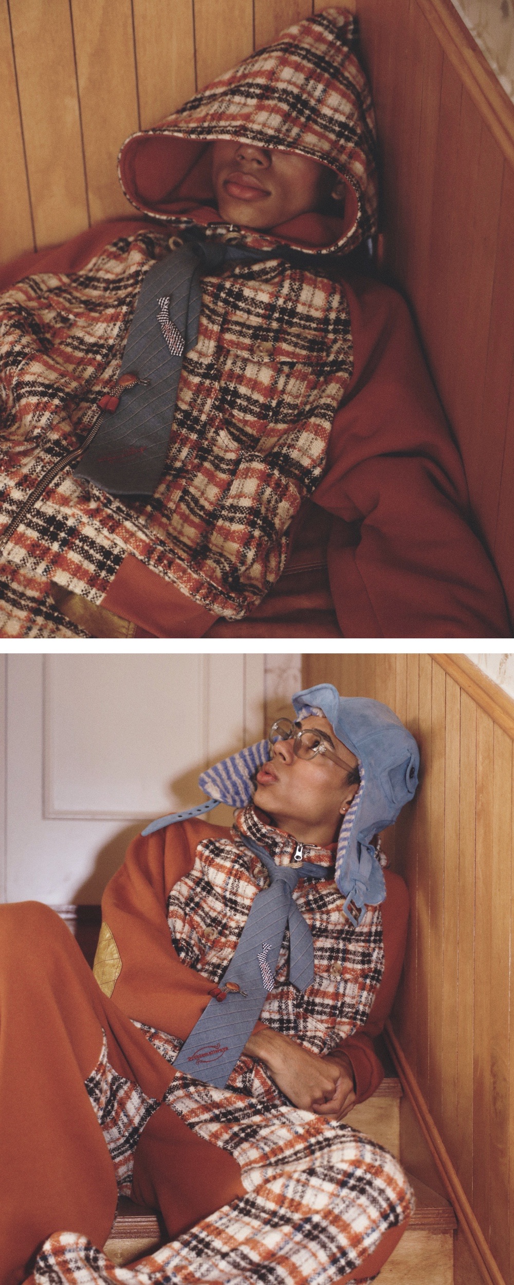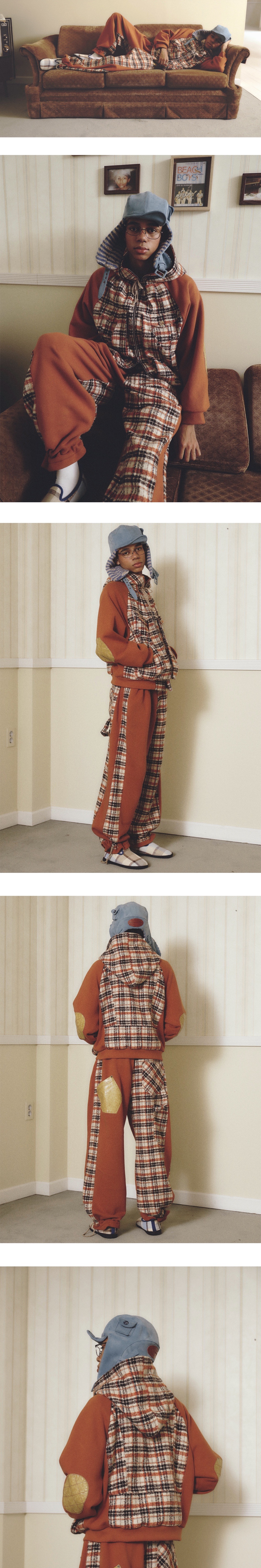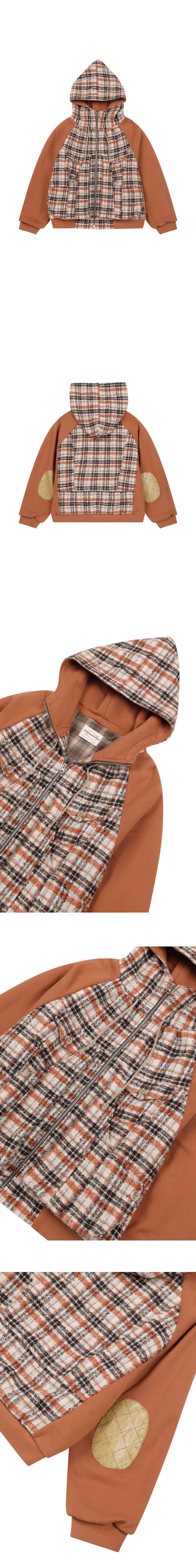 쭈리: Cotton 100% / 체크: Polyester 100% 아빠와의 추억을 담은 건빵주머니 디테일 세미 레귤러핏 후드집업 점퍼 고밀도 헤비쭈리 원단 넥라인 해링본 스트링 팔꿈치 레더 패치 넥 라인 투 턱 디테일 안감 체크 원단 디테일 YKK 투웨이 지퍼 *Model: 184cm, 68kg