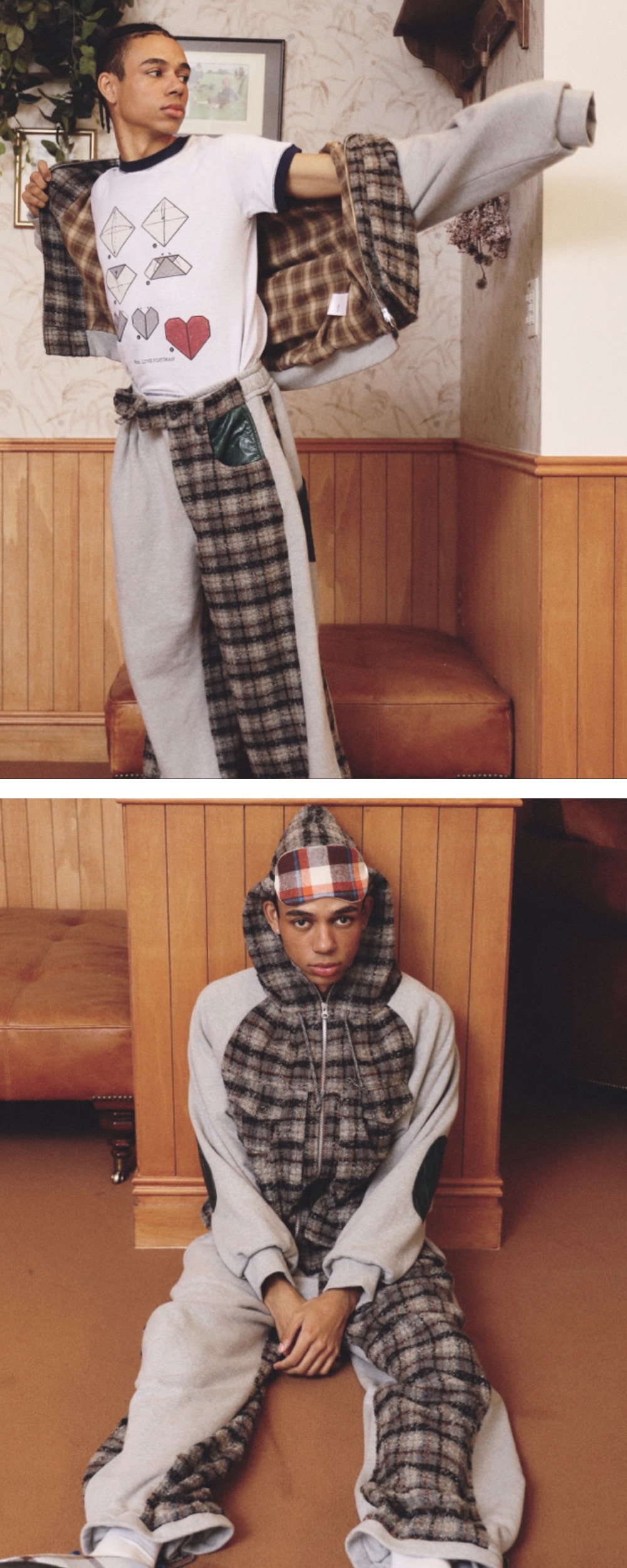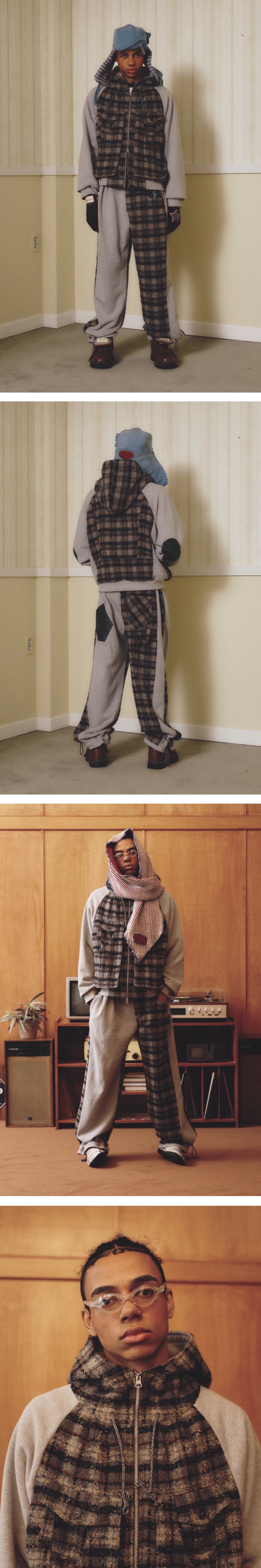 쭈리: Cotton 100% / 체크: Polyester 100% 아빠와의 추억을 담은 건빵주머니 디테일 세미 레귤러핏 후드집업 점퍼 고밀도 헤비쭈리 원단 넥라인 해링본 스트링 팔꿈치 레더 패치 넥 라인 투 턱 디테일 안감 체크 원단 디테일 YKK 투웨이 지퍼 *Model: 184cm, 68kg