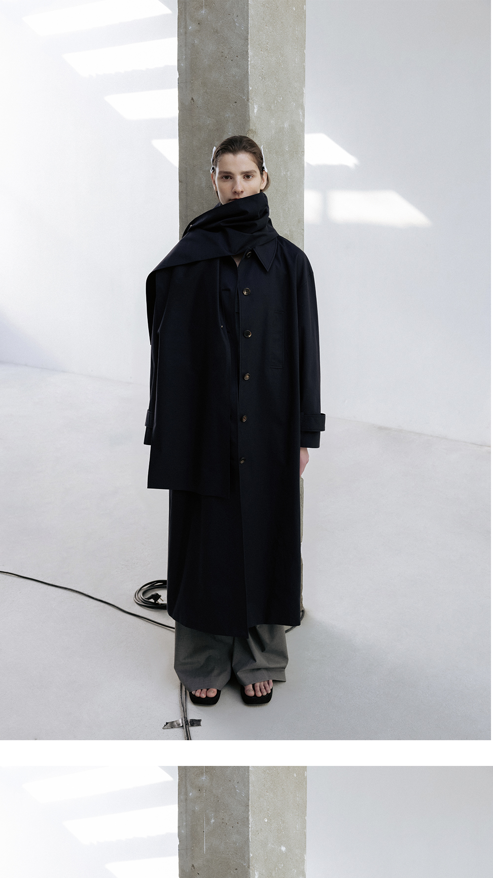 트윌 코튼 소재를 이용한 클래식한 디자인의 트렌치코트입니다. 매끄러우면서도 탄탄한 가공이 특징인 코튼소재로 실루엣에 신경을 쓴 아이템입니다. 소매에 턱 디테일을 넣어 볼륨있는 슬리브 실루엣을 보여주며 브라운톤의 소뿔버튼으로 마무리를 하였습니다. 뒤쪽에 턱 디테일을 넣어 입체적인 실루엣을 보여줍니다. 롱한 기장감의 코튼 머플러는 다양한 스타일링을 할 수 있게 여유있는 폭과 길이로 디자인하였습니다.