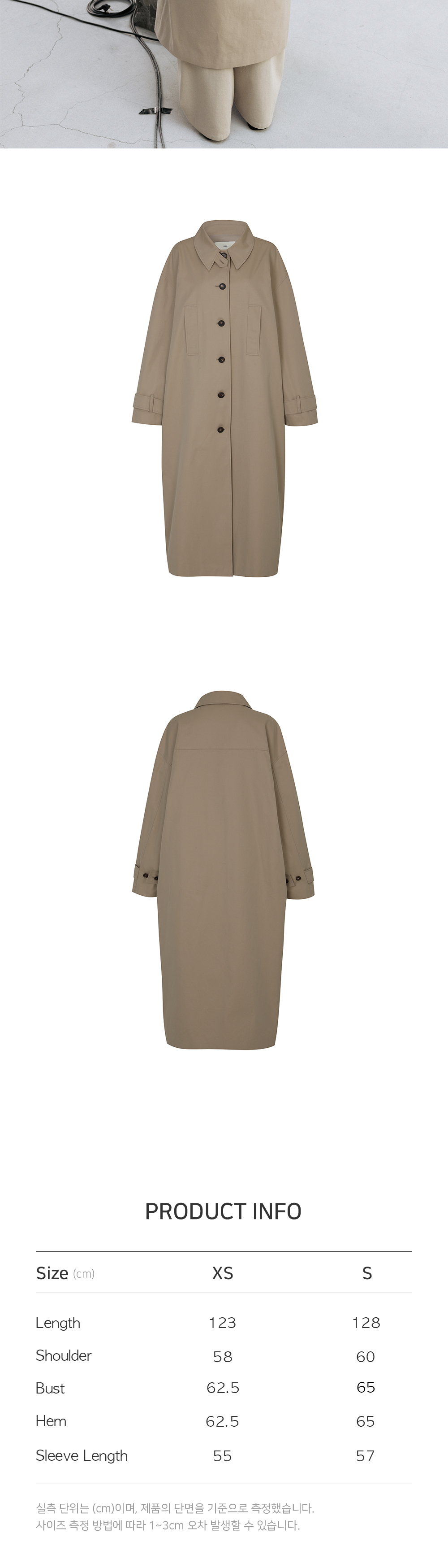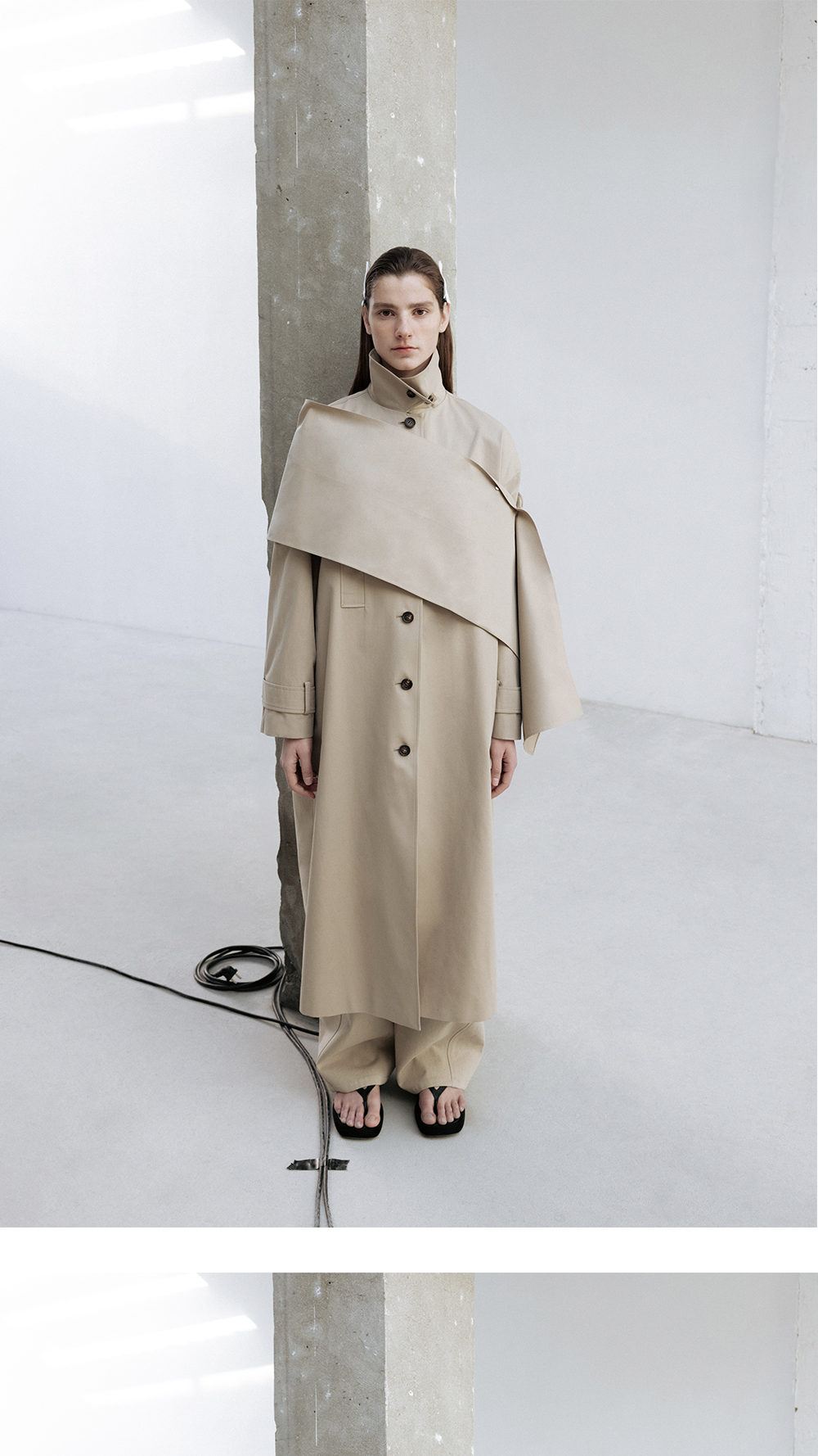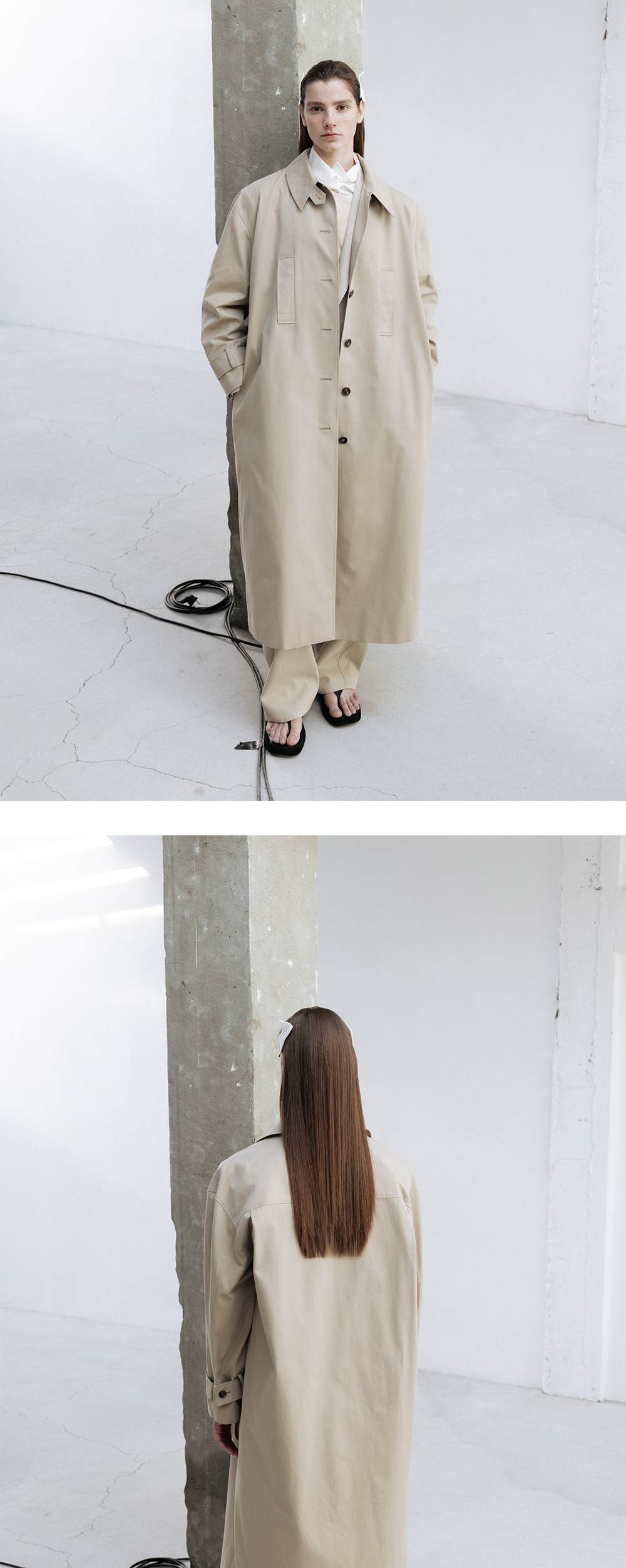 트윌 코튼 소재를 이용한 클래식한 디자인의 트렌치코트입니다. 매끄러우면서도 탄탄한 가공이 특징인 코튼소재로 실루엣에 신경을 쓴 아이템입니다. 소매에 턱 디테일을 넣어 볼륨있는 슬리브 실루엣을 보여주며 브라운톤의 소뿔버튼으로 마무리를 하였습니다. 뒤쪽에 턱 디테일을 넣어 입체적인 실루엣을 보여줍니다. 롱한 기장감의 코튼 머플러는 다양한 스타일링을 할 수 있게 여유있는 폭과 길이로 디자인하였습니다.
