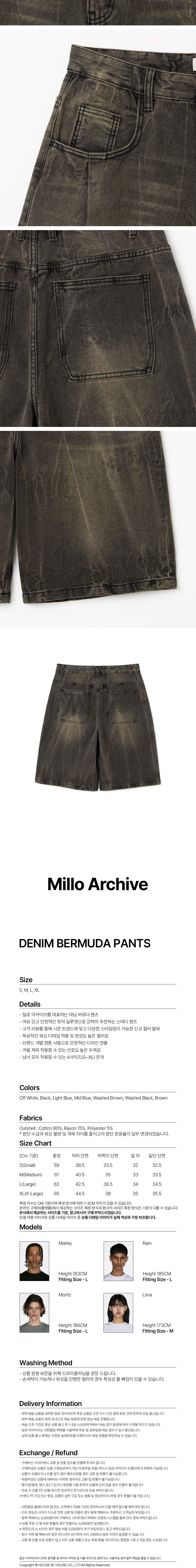 - 밀로 아카이브를 대표하는 데님 버뮤다 팬츠 - 여유 있고 안정적인 핏의 실루엣으로 강력히 추천하는 스테디 팬츠 - 고객 리뷰를 통해 시즌 트렌드에 맞고 다양한 스타일링이 가능한 신규 컬러 발매 - 독보적인 워싱 디테일 적용 및 완성도 높은 컬러감 - 브랜드 개발 캔톤 사용으로 안정적인 디자인 연출 - 겨울 제외 착용할 수 있는 선호도 높은 두께감 - 남녀 모두 착용할 수 있는 4사이즈(S~XL) 전개 * 워싱을 진행한 팬츠로 같은 라인업 상품 중 미드 블루, 라이트 블루, 워시드 블랙 컬러와 사이즈가 동일 합니다.
