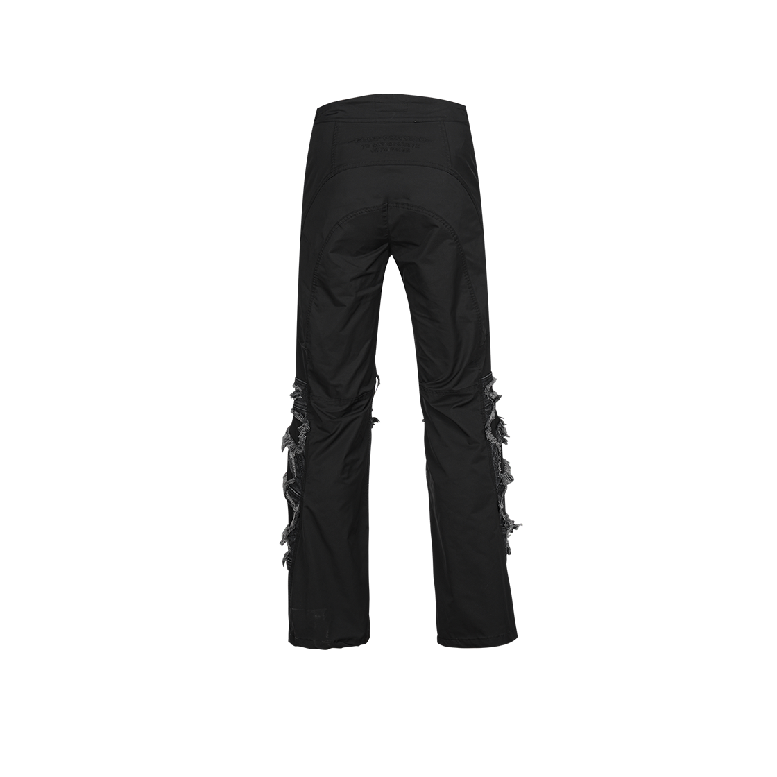 코튼 나일론 혼방 원단의 가먼트 다잉 모터팬츠. 전면 지퍼 여밈과 스냅버튼 잠금. 금속 버클을 이용한 허리 조리개. 전면 두개의 주머니. 스트레치 소재의 패널 구조. 데미지 가공된 데님 원단을 이용한 입체적 이중 구조의 하단부. 후면 로고 자수 디테일. Cotton nylon garment dyed motor pants. Zip closure with metal snap button at front. Size adjustment strap at side with metal hardware. Two front pocket. Stretch fabric panel. Two faces structure with Damage washed denim fabric at lower part. Logo embroidery at rear. SHELL A : 100% POLYESTER / 100% COTTON SHELL B : 100% COTTON MADE IN KOREA