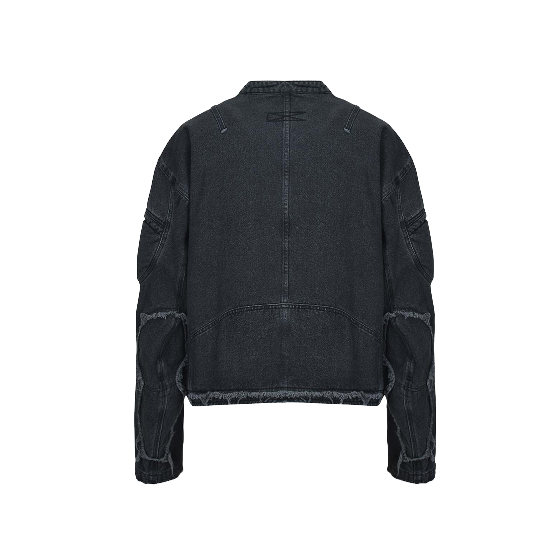 애시드 워싱 헤비웨이트 데님 모터자켓 전면 지퍼 여밈 전면 라인테이프 디테일 어깨 스트레치 패널 소매 패디드 디테일 소매와 후면에 로엣지 장식 뒷목 자수 디테일 소맷단에 지퍼 트임 Acid washed heavy weight denim motor jacket Loop details at front Stretch fabric panel at shoulder Padded details at sleeves Raw edge details at cuffs and back Embroidery at back Zip vents at cuffs SHELL A : 100% COTTON SHELL B : 97% COTTON/ 3% SPAN MADE IN KOREA