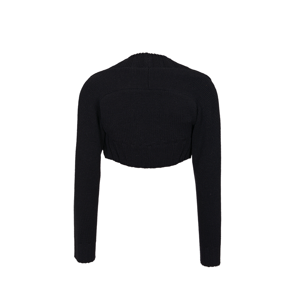 두터운 니트 볼레로 자켓 목에 감는 형태의 끈과 메탈 소재의 팁 앞단과 밑단이 이어지는 형태 Heavy weight knit bolero jacket Neck string with metal hardware tip Ribbed hem Wool 50% / Acrylic 50% MADE IN KOREA