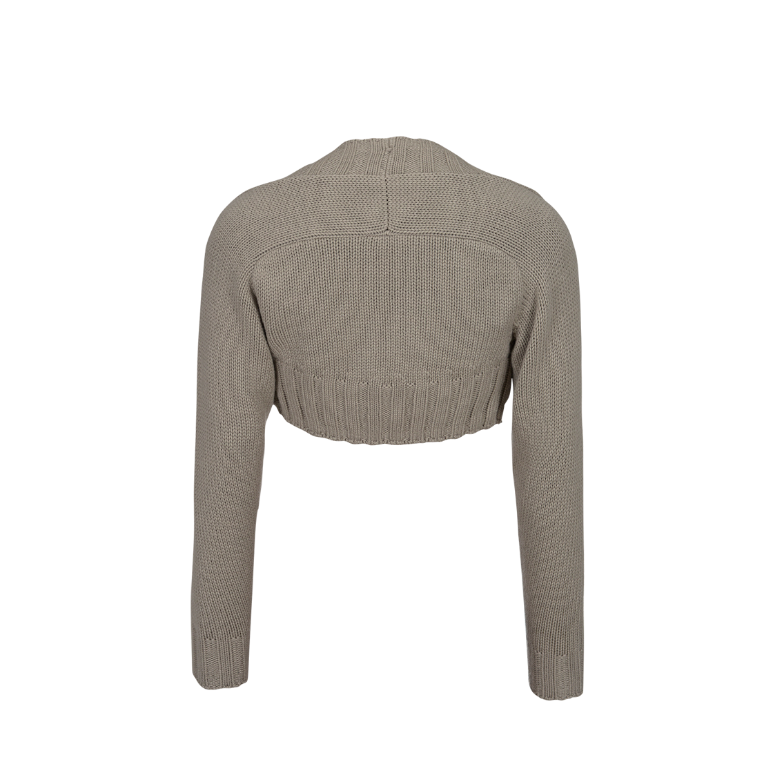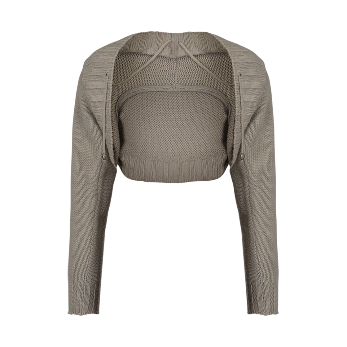 두터운 니트 볼레로 자켓 목에 감는 형태의 끈과 메탈 소재의 팁 앞단과 밑단이 이어지는 형태 Heavy weight knit bolero jacket Neck string with metal hardware tip Ribbed hem Wool 50% / Acrylic 50% MADE IN KOREA