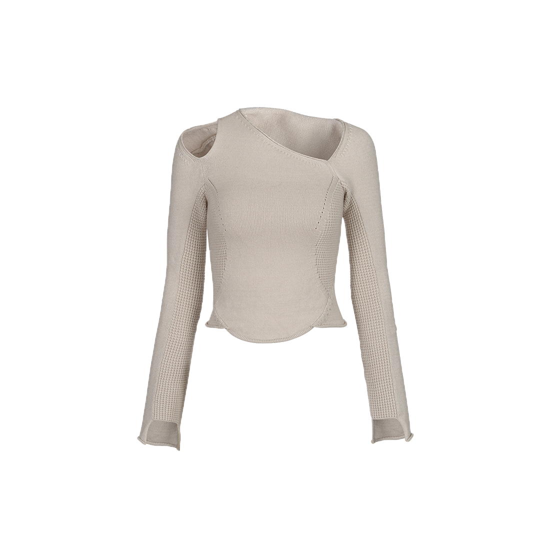 비대칭 숄더 니트 탑 여러가지 짜임 형태가 조합된 패널 곡선 형태의 밑단 단차가 있는 형태의 소매 Asymmetry shoulder Knit top Panels using various types of weaves Curved front hem Stepped cuffs Rayon 52% / Nylon 20% / Poly 28% MADE IN KOREA