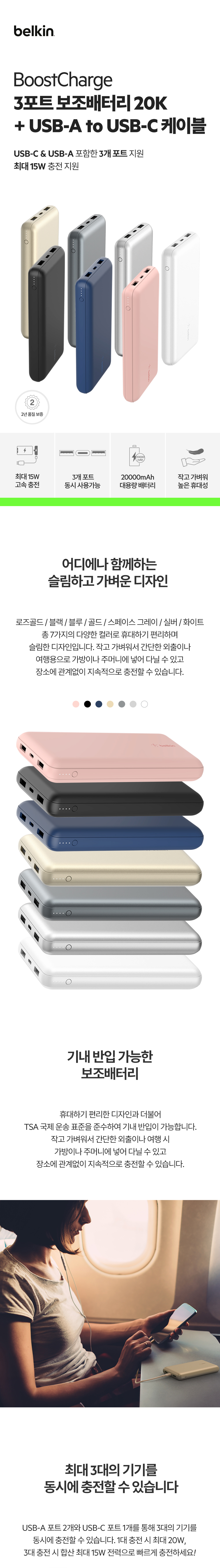 벨킨 20000mAh 3-port 15W PD 고속 충전 보조배터리 BPB012bt 화이트