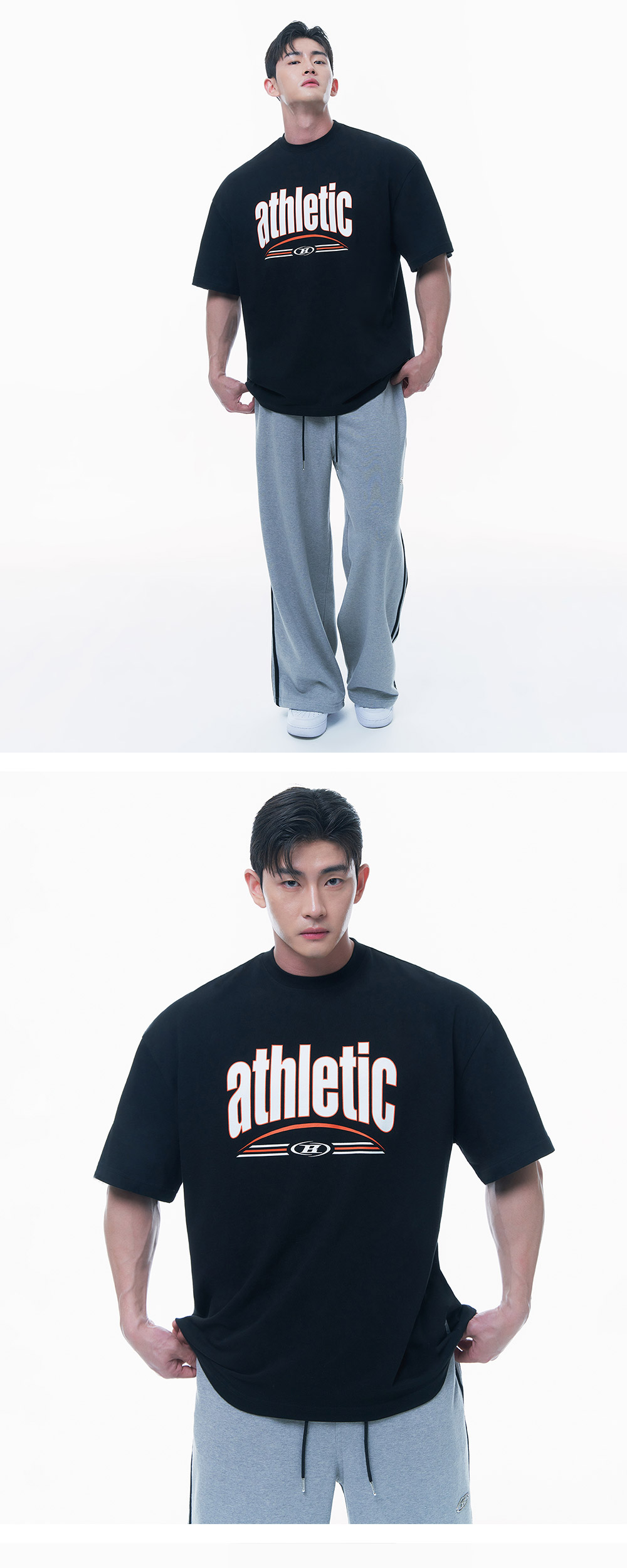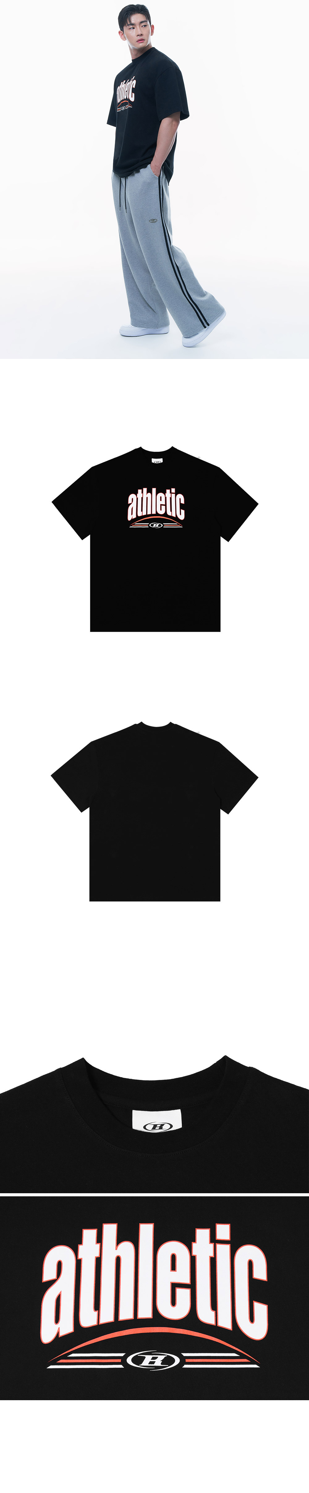 [DETAILS] * 에슬래틱 반팔 티셔츠 - 텐타덤블 가공 16수 원단 - 넉넉한 실루엣의 오버사이즈 핏 - 스포티한 아치형 프린팅 - 측면 장식 실리콘 와펜 Material : COTTON 100% Fitting : 2 Size, 183cm, 90kg