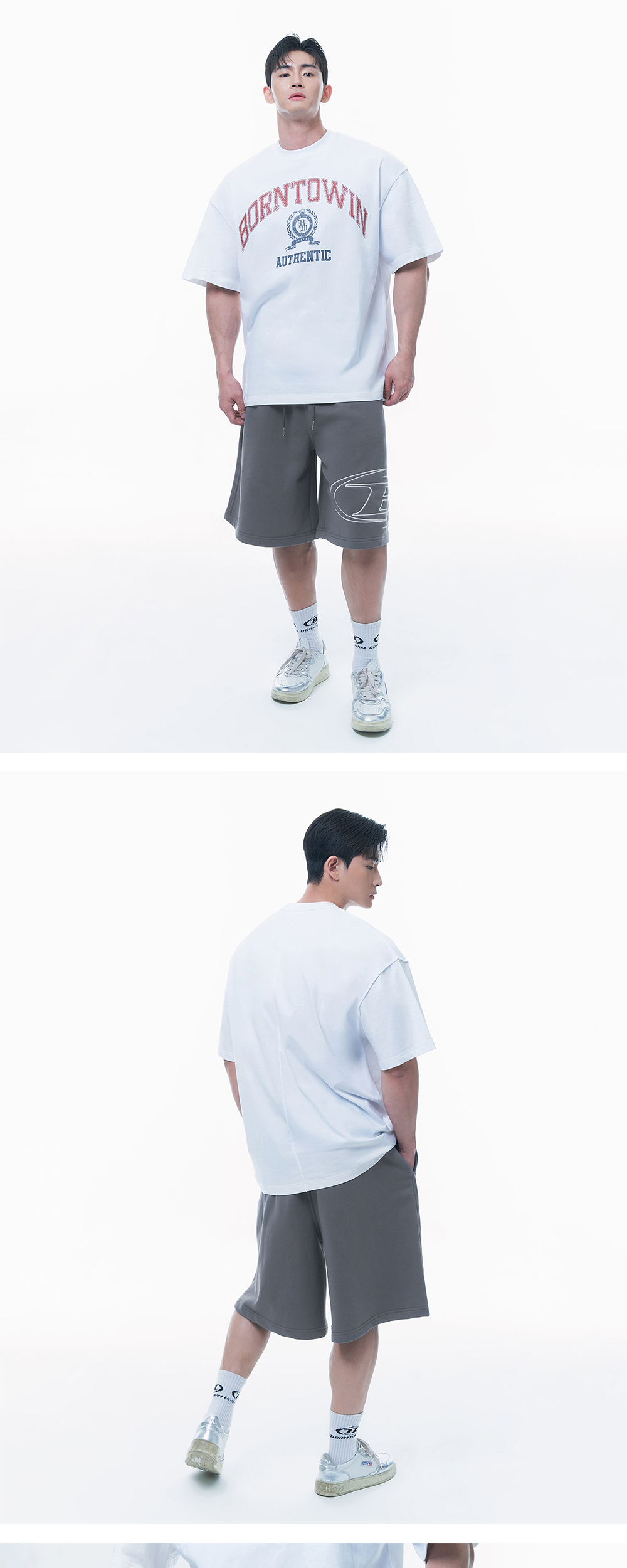 [DETAILS] * 스트로크 B 로고 하프 팬츠 롱버전 - 여유로운 실루엣의 오버사이즈 핏 - 우측면 빅 심볼 B 자수 디테일 - 좌측면 본투윈 레터링 프린팅 - 활용도 좋은 후면 포켓 Material : COTTON 60%, POLYESTER 40% Fitting : 2 Size, 183cm, 90kg