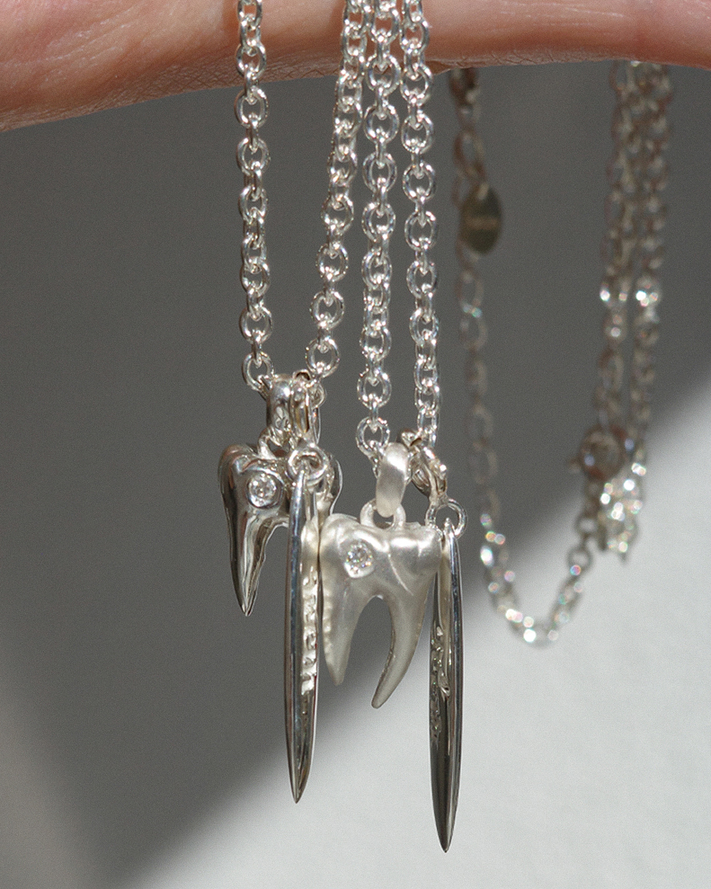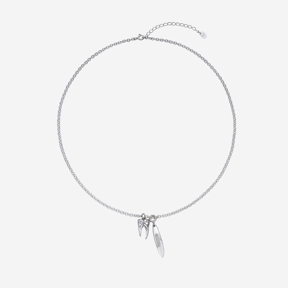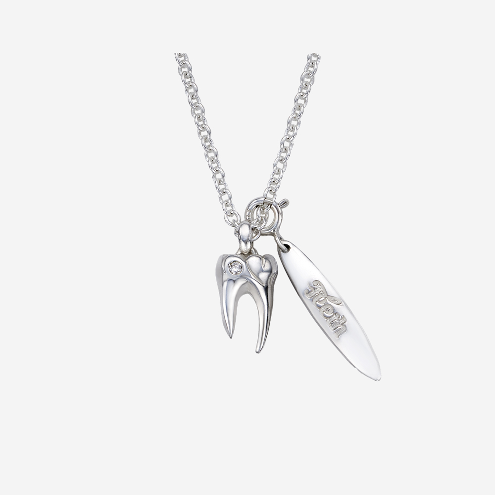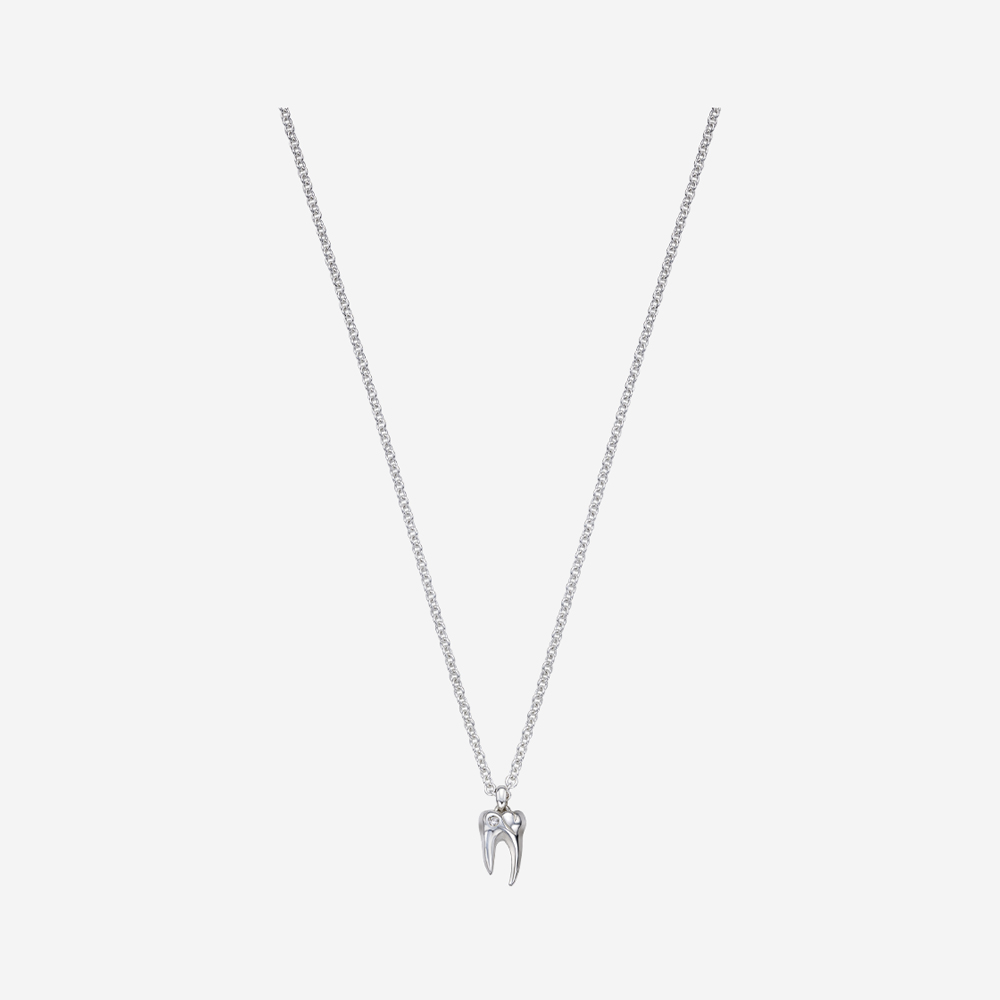 ABOUT ‘은니’에 1.7mm 라운드 컷 천연 다이아몬드를 세팅한 투스젬 네클리스입니다. 지구상에서 가장 단단한 자연 물질인 다이아몬드는 굳건한 강인함과 순백의 순수함을 상징하며, 4월의 탄생석으로서 소중한 존재감을 뽐냅니다. ‘Teeth 실버 플레이트’는 탈착이 가능하여, 스타일링에 따라 원하는 위치에 걸어 색다른 재미를 느껴보실 수 있습니다.