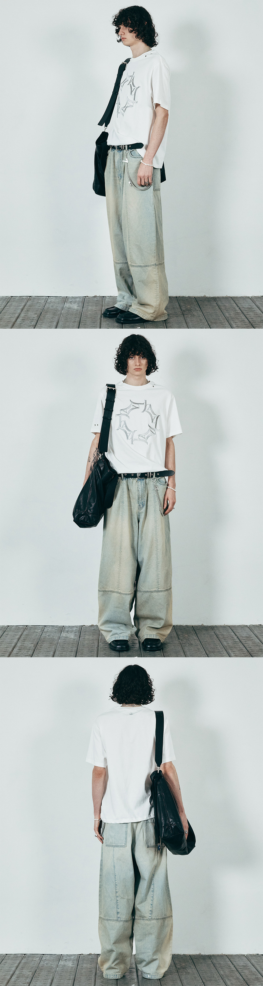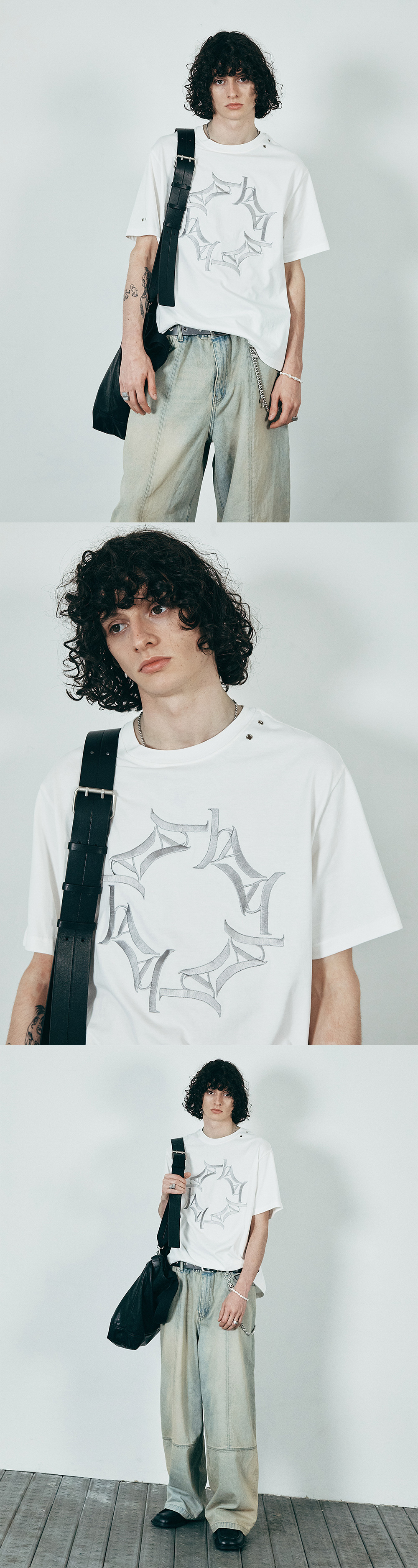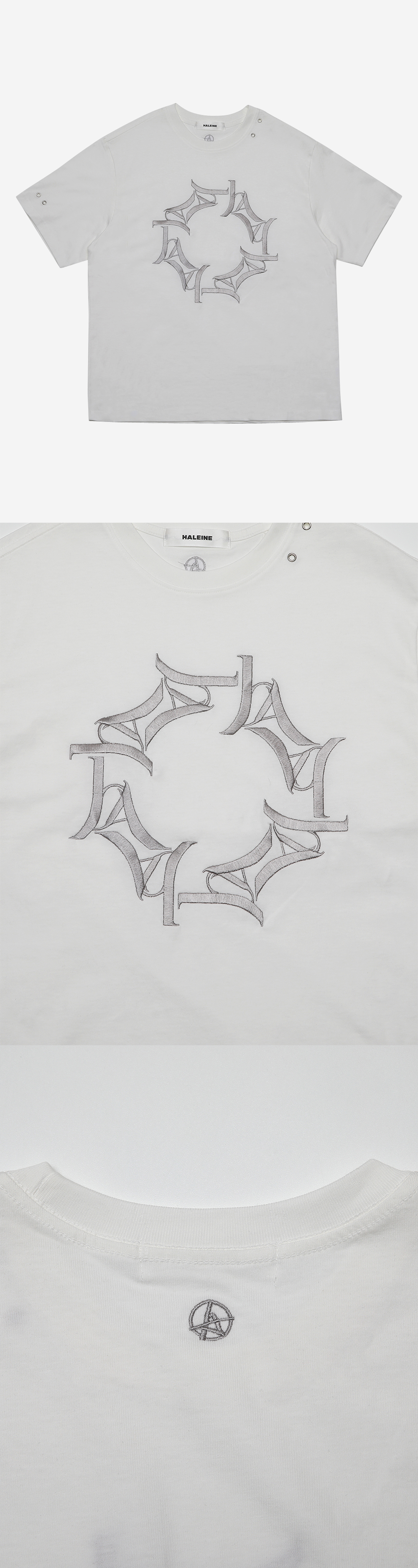 HALEINE H.A 심볼을 자수 기법으로 표현한 숏슬리브 입니다. 아일렛 디테일과 자수 심볼의 조화가 돋보이는 제품입니다. - DETAIL - 라운드 크루넥 메탈 아일렛 디테일 전면 심볼 자수 후면 로고 자수 레귤러 핏