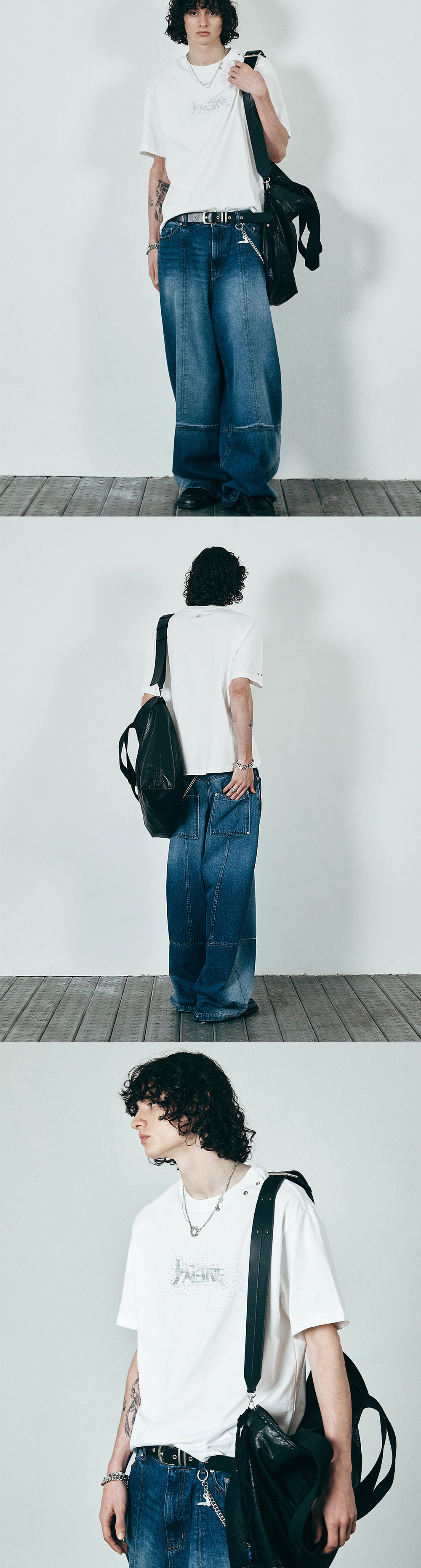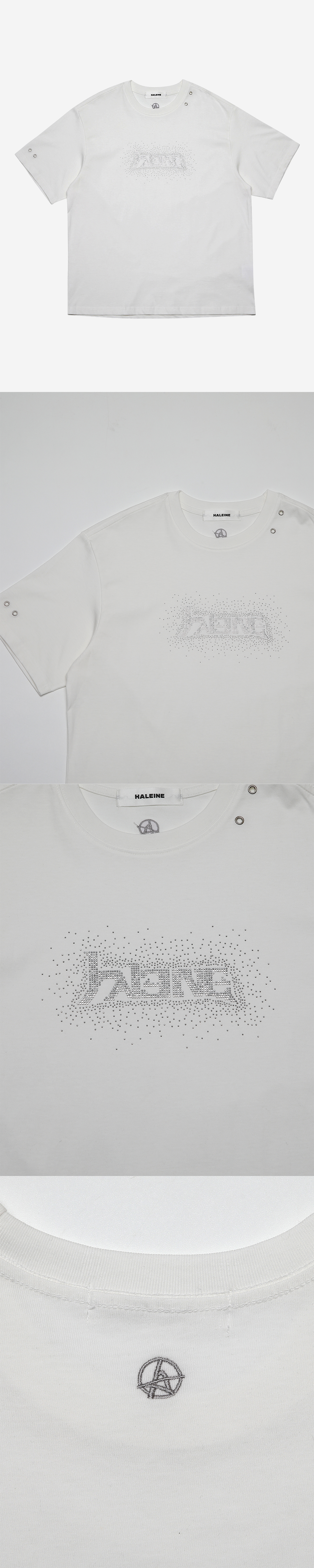 HALEINE 로고를 라인스톤 기법으로 표현한 숏슬리브입니다. 아일렛 디테일과 라인스톤의 조화가 돋보이는 제품입니다. _x000B_- DETAIL - 라운드 크루넥 메탈 아일렛 디테일 전면 로고 라인스톤 장식 후면 로고 자수 레귤러 핏