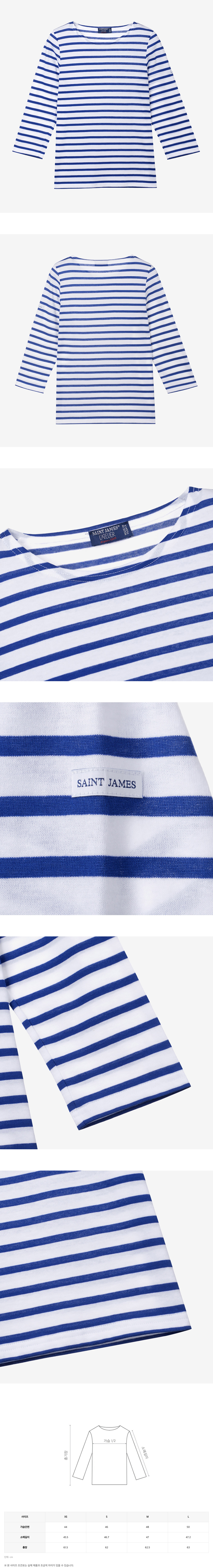 7부 기장의 보트넥 스트라이프 티셔츠. 클래식한 디자인의 가벼운 면 제품. 왼쪽 팔에 세인트 제임스 로고 패치가 붙어 있다.