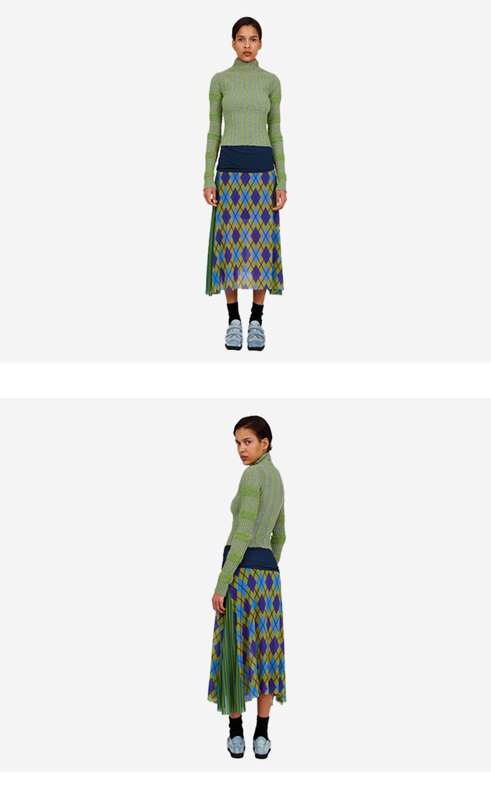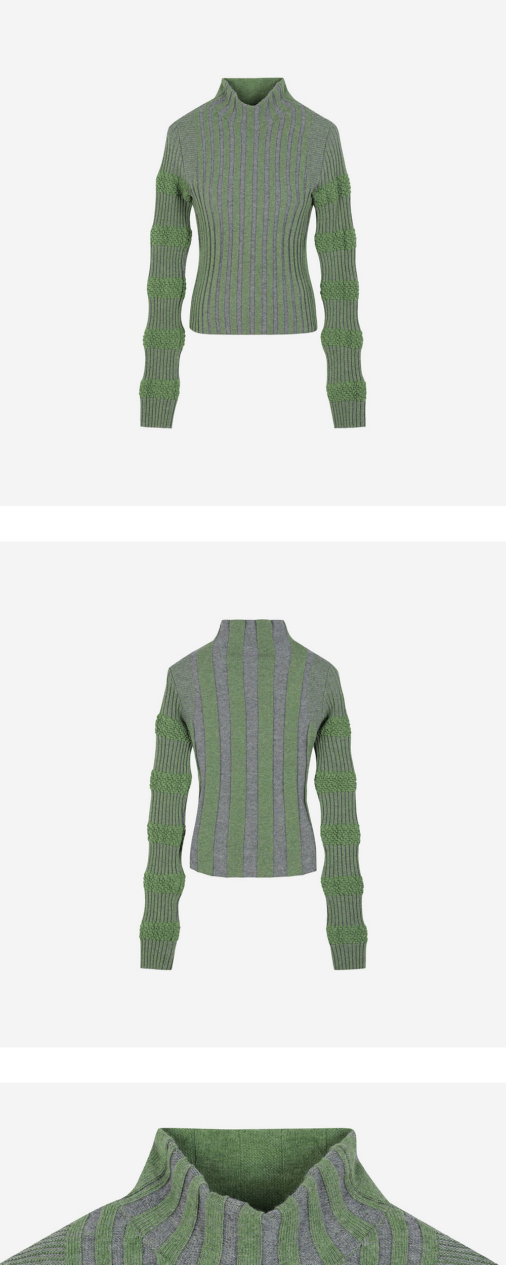 스트라이프 골지 원단과 소매의 주름진 퍼프 디테일이 특징인 파울라 카노바스 델 바스의 리브드 니트 탑입니다. 하이넥과 조화로운 컬러가 클래식함을 더해줍니다.