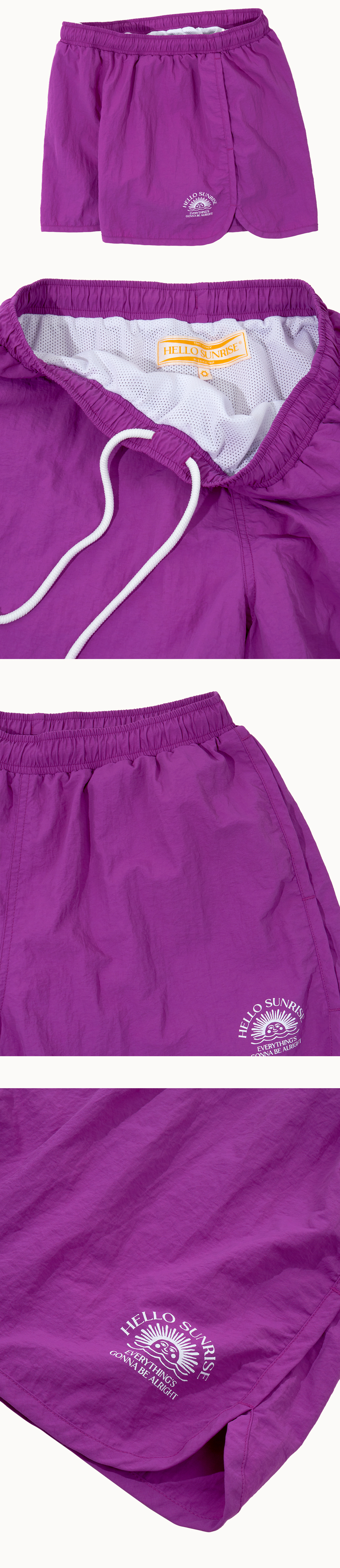 Hello Sunrise 레귤러핏의 짧은 기장감의 여성용 스윔팬츠입니다.<br><br> - 전면 헬로 선라이즈 로고 그래픽<br> - 허리 밴딩으로 사이즈 조절이 용이<br> - 사이드 2개의 포켓<br> - 부드러운 메쉬 안감 사용으로 편안한 착용감 제공<br> - 포켓에 메쉬 덫댐 사용으로 물의 배출 용이<br> - 수영복과 일상복으로의 이중 사용 가능<br><br> * Shell : Nylon 100%<br><br> * Made in Vietnam<br>
