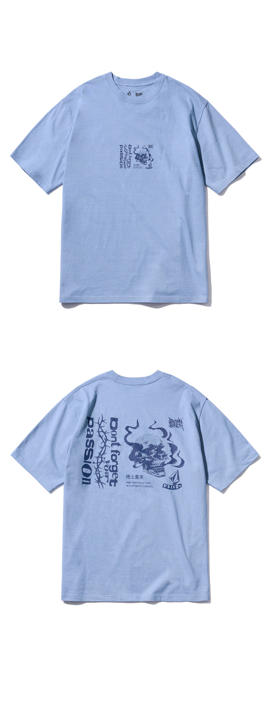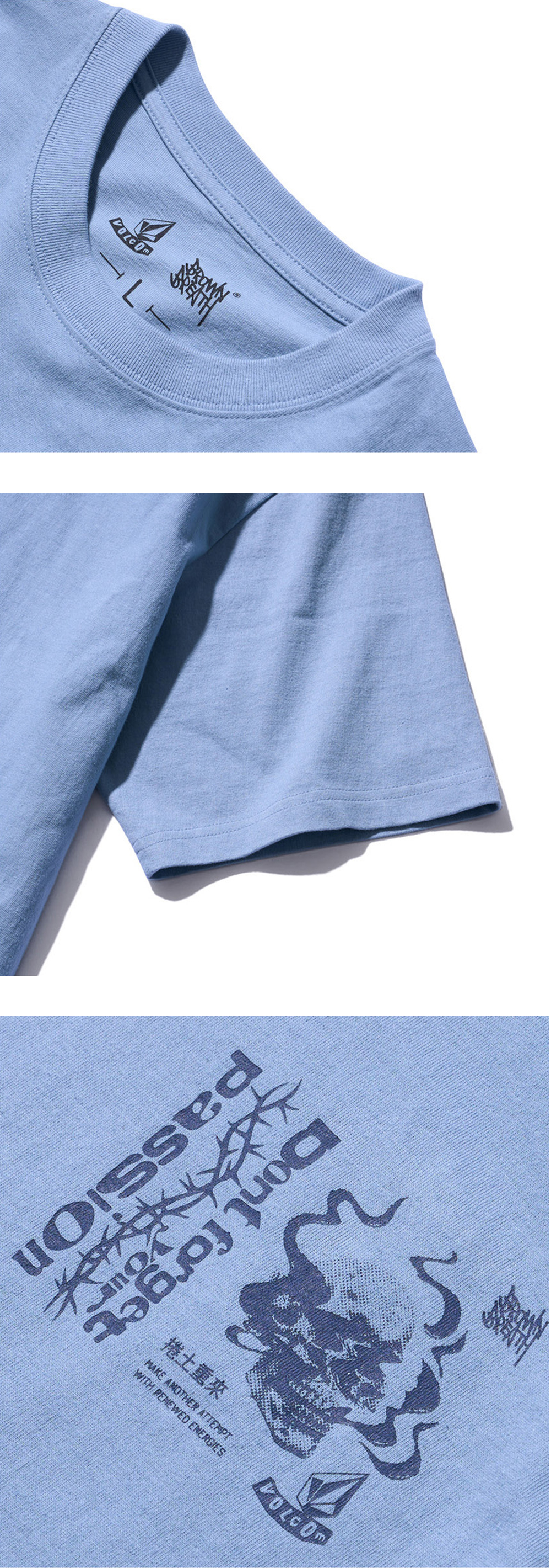 20수 싱글 면 100% 소재 원단 수축 최소화를 위해 덴타, 덤블, 바이오 가공 넥라인 늘어남 방지를 위한 테이핑 처리 볼컴과 브라운브레스의 협업 그래픽 프린팅