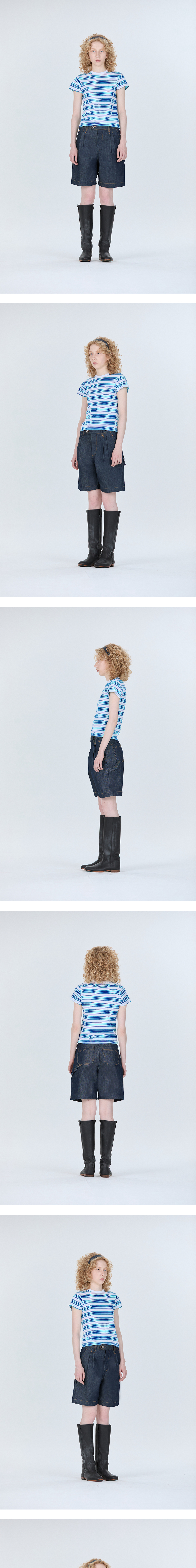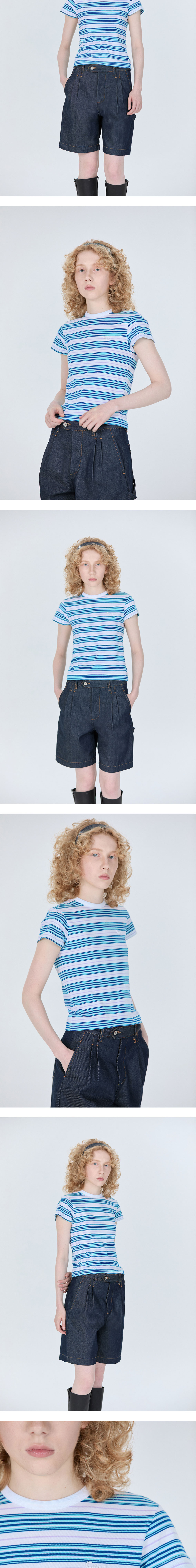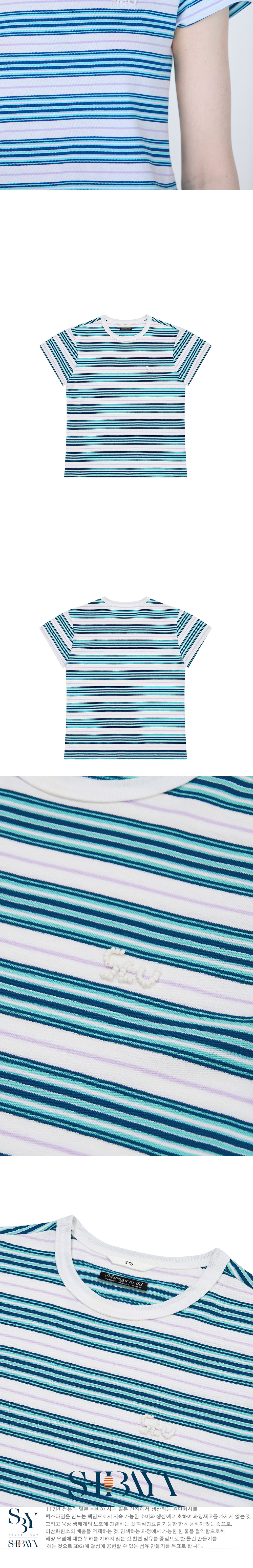 에스티유 우먼즈 스트라이프 로고 비즈 티셔츠 민트 블루