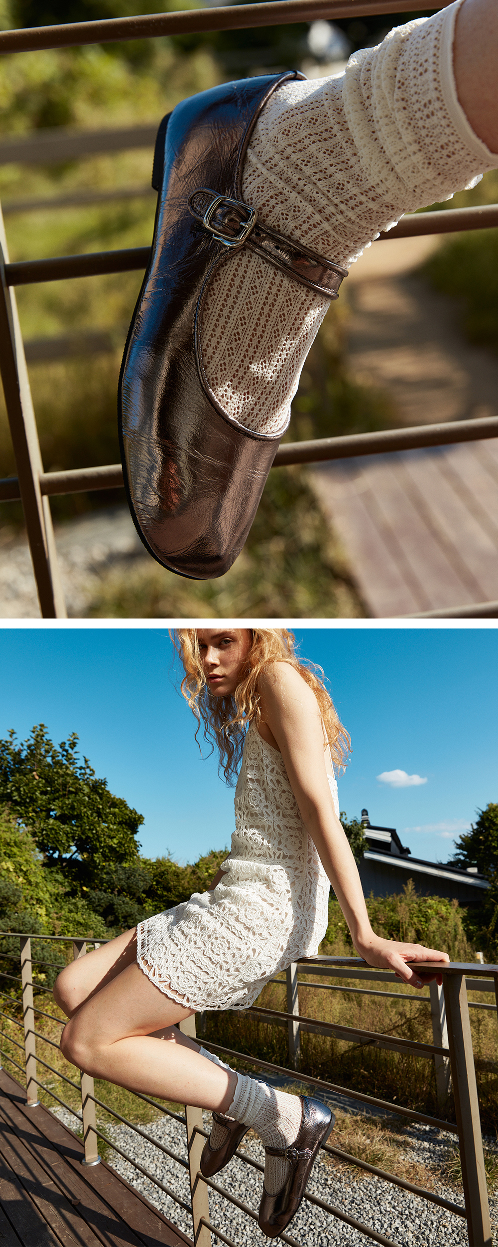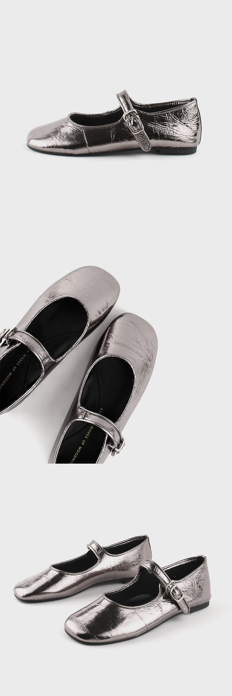 귀엽고 사랑스러운 느낌의 가득 담긴 메리제인 타입의 디자인에 발볼이 넓으신 분들도 충분히 편안하게 커버 가능하신 라운드 쉐입의 쫀득한 2중 라텍스 중창을 가지고 있는 플랫슈즈 입니다. 실제로 확인했을 때 그 매력이 더욱 돋보이는 크랙 질감의 메탈릭 레더로 제작 되었으며, 신으면서 자연스러운 주름이 지는 것이 너무나 매력적인 소재입니다. 발등이 닿는 내피는 신축성 좋은 네오프렌으로 마감했으며, 말캉한 러버 아웃솔은 걸음걸이가 매우 편안합니다.