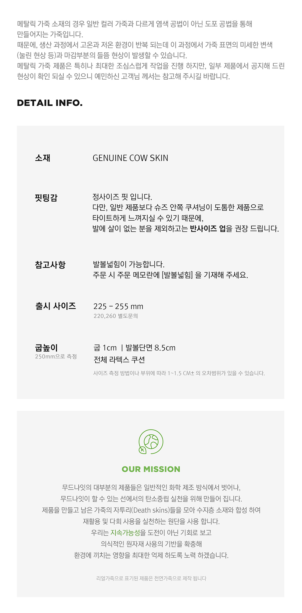 발볼넓힘 또는 특수사이즈 변경을 희망하시는 분들은 주문서의 배송요청사항 칸에 입력 부탁드립니다. 사양변경 주문건은 수령 후 교환/반품이 불가 합니다.