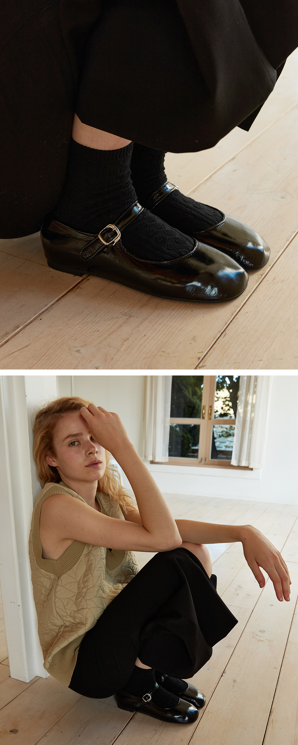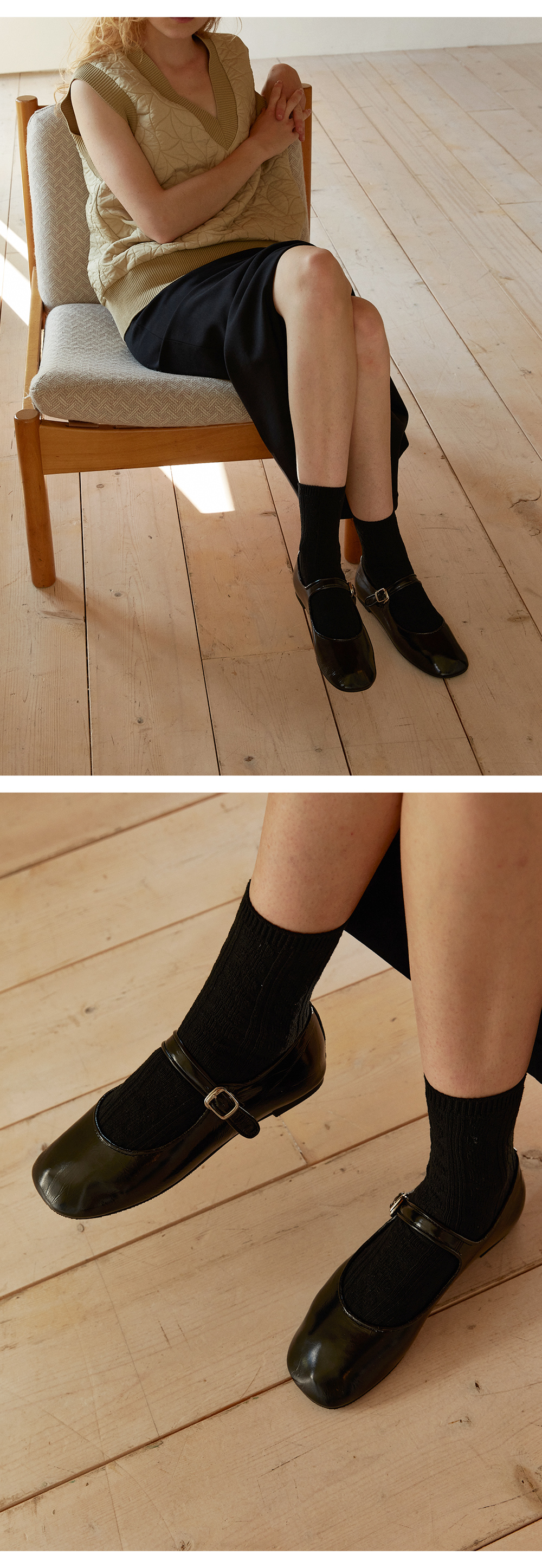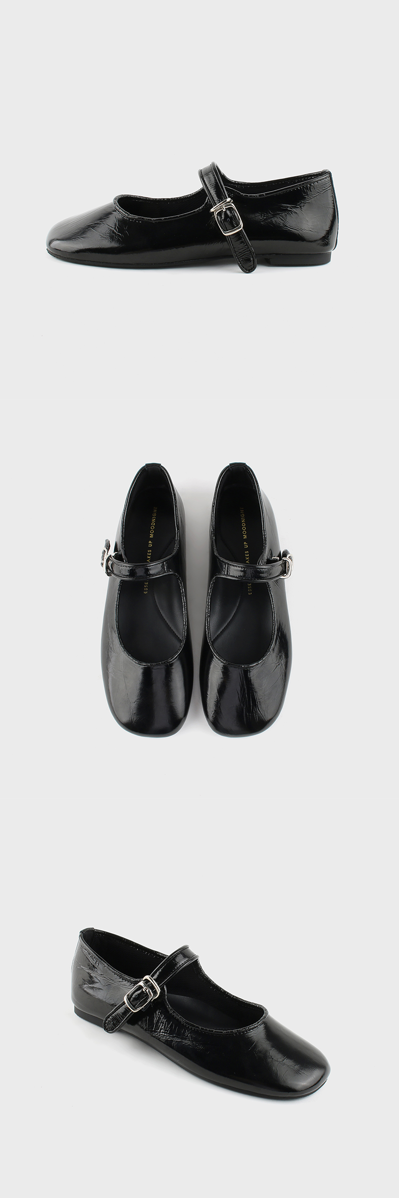 귀엽고 사랑스러운 느낌의 가득 담긴 메리제인 타입의 디자인에 발볼이 넓으신 분들도 충분히 편안하게 커버 가능하신 라운드 쉐입의 쫀득한 2중 라텍스 중창을 가지고 있는 플랫슈즈 입니다. 실제로 확인했을 때 그 매력이 더욱 돋보이는 크랙 질감의 메탈릭 레더로 제작 되었으며, 신으면서 자연스러운 주름이 지는 것이 너무나 매력적인 소재입니다. 발등이 닿는 내피는 신축성 좋은 네오프렌으로 마감했으며, 말캉한 러버 아웃솔은 걸음걸이가 매우 편안합니다.