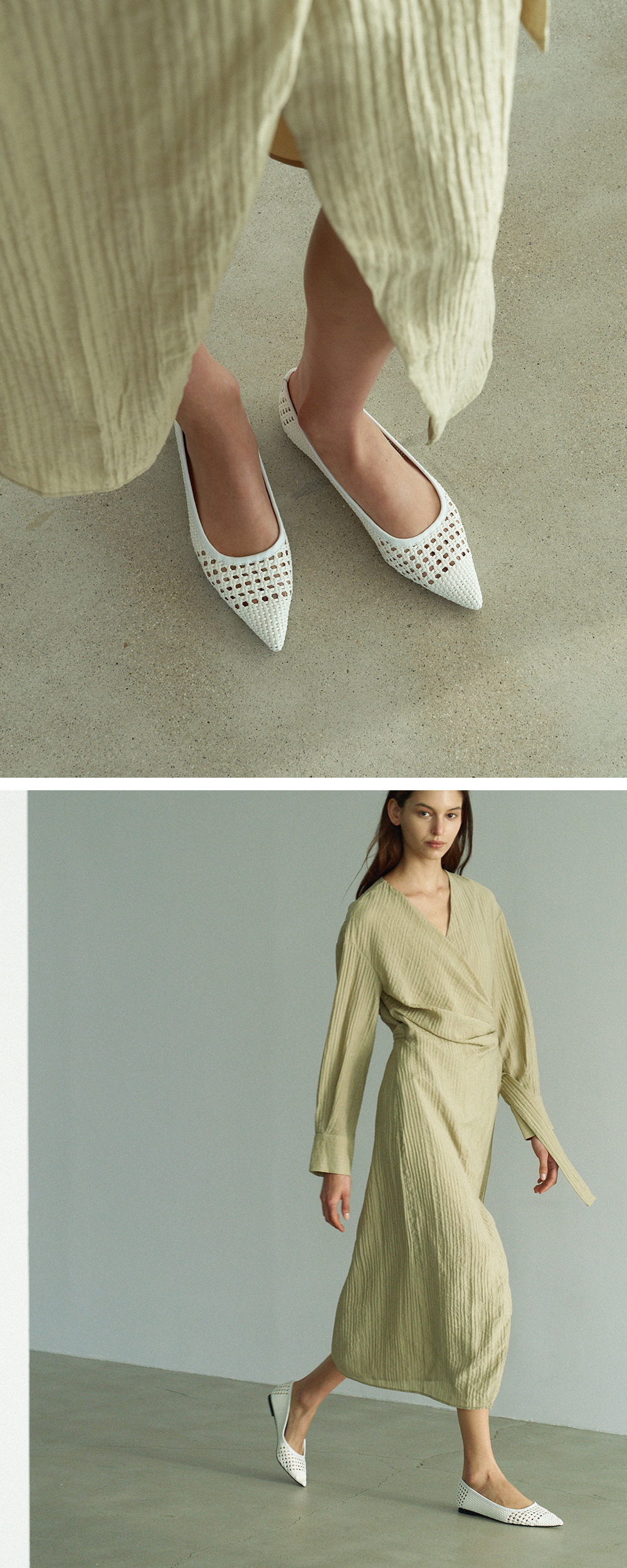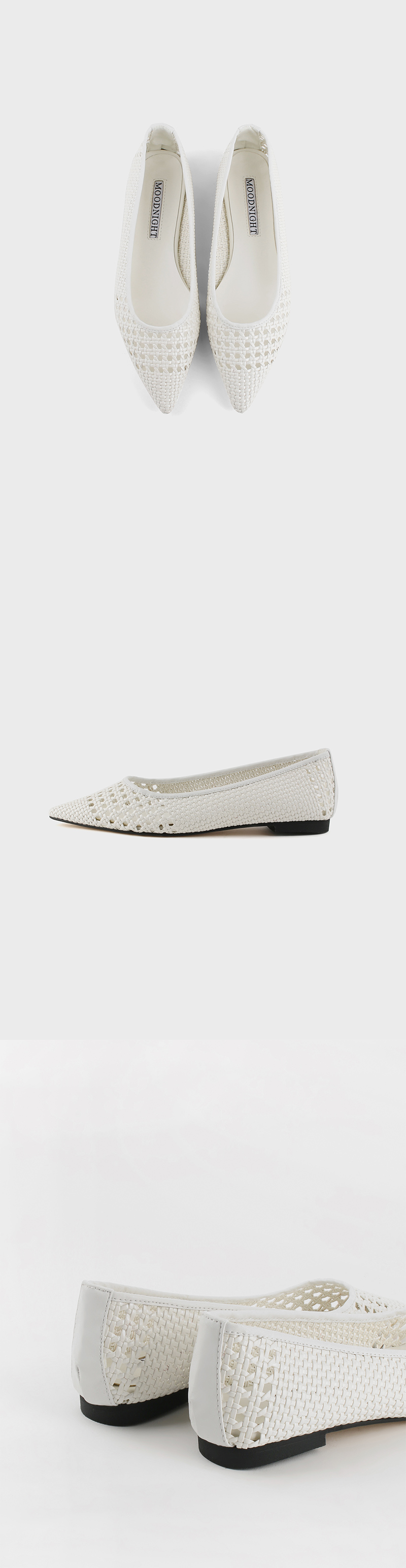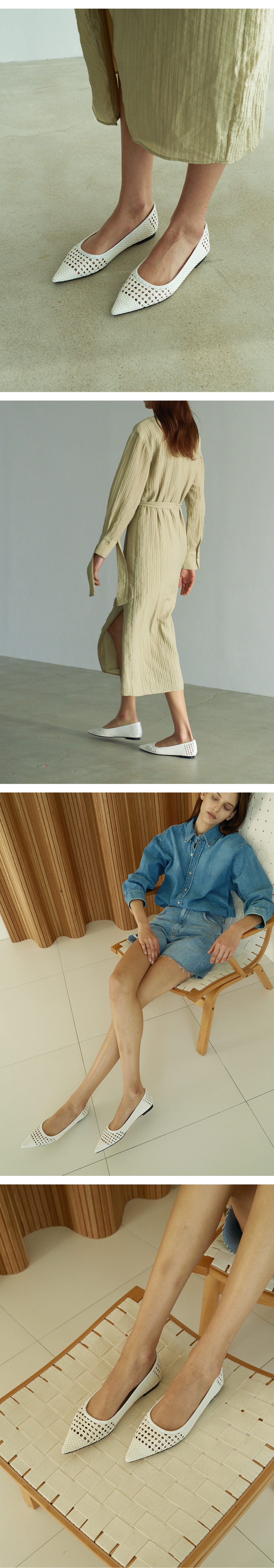 한줄 한줄 핸드 공법으로 제작 되어지는 위빙 소재는 발의 실루엣에 따라 유연하게 핏트 되며 단품 만으로도 드레스업 되는 소재 입니다. 플랫이지만 갖춘 듯한 룩으로 세련되게 신으실 수 있는 제품입니다. 입체감 있는 우아한 곡선미를 자랑하는 쉐입으로 안정감 있게 즐기실 수 있습니다.