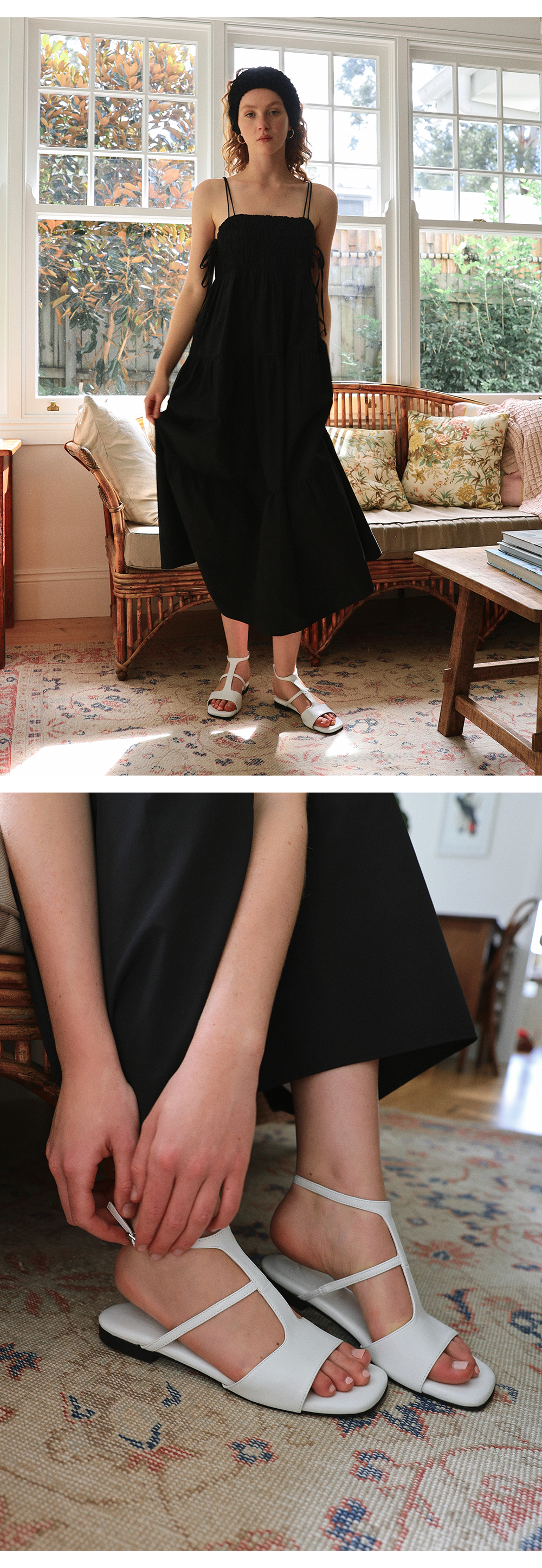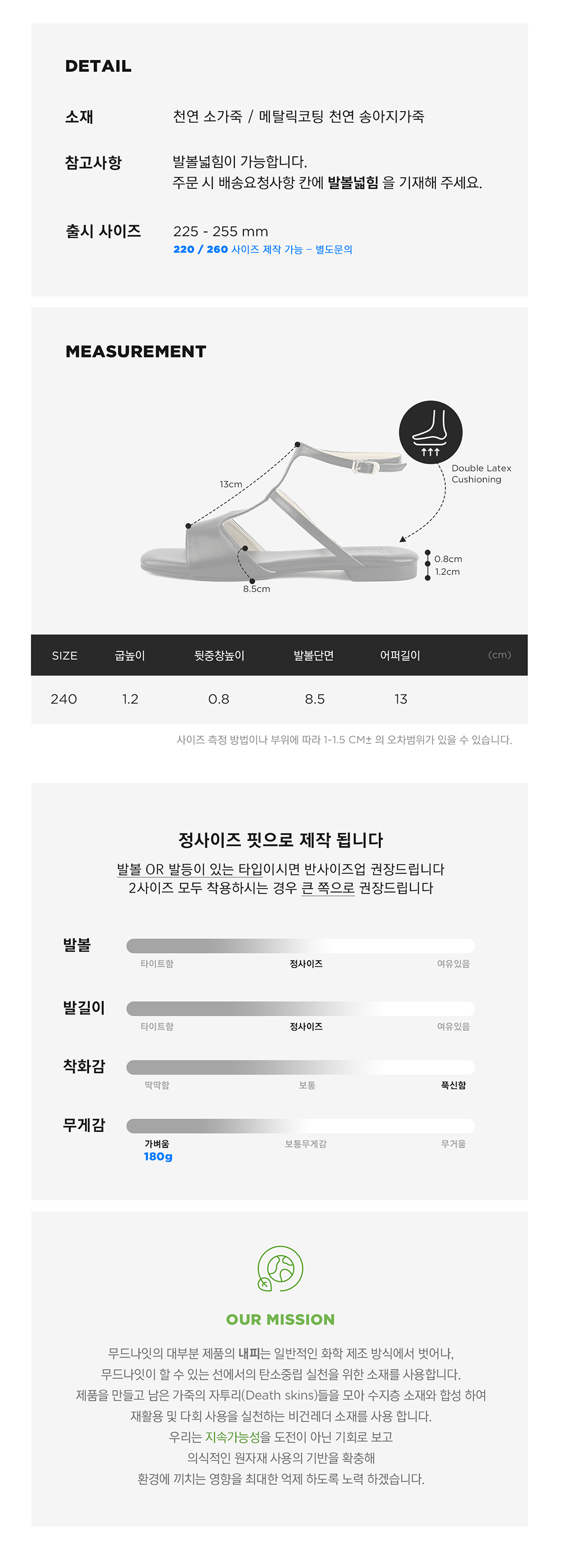 - 발등 부터 발목 까지 부드럽게 흐르는 실루엣의 글레디에이터 샌들 - 신었을 때의 슬림한 시각효과가 매력적인 아이템 - 편하게 단품만으로 충분히 드레스업 가능한 존재감 - 유연하고 부드러운 라텍스 쿠셔닝으로 활동적이고 편안한 착화감
