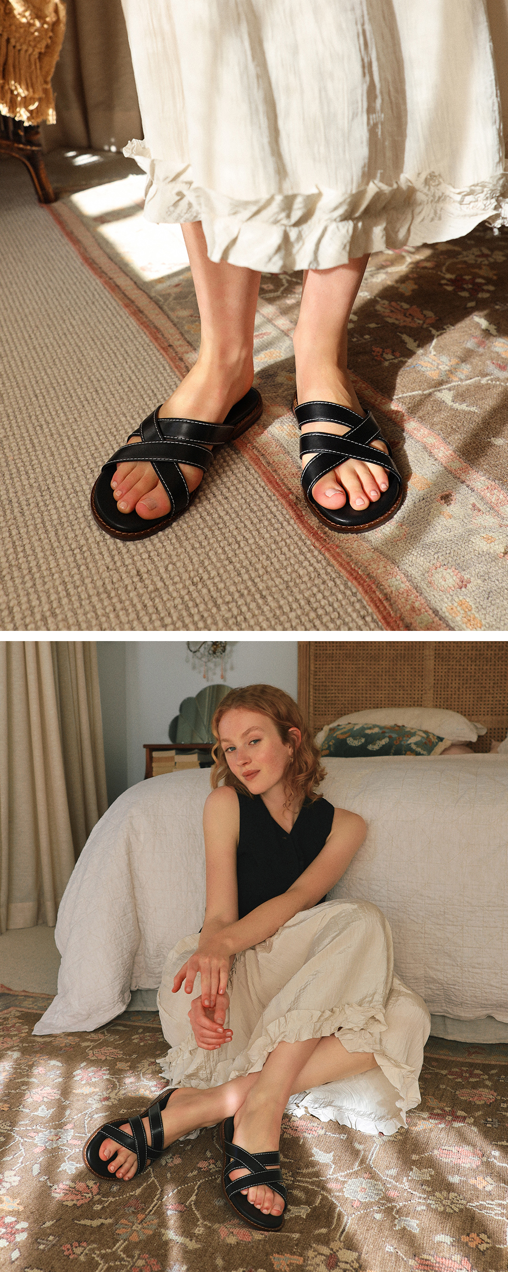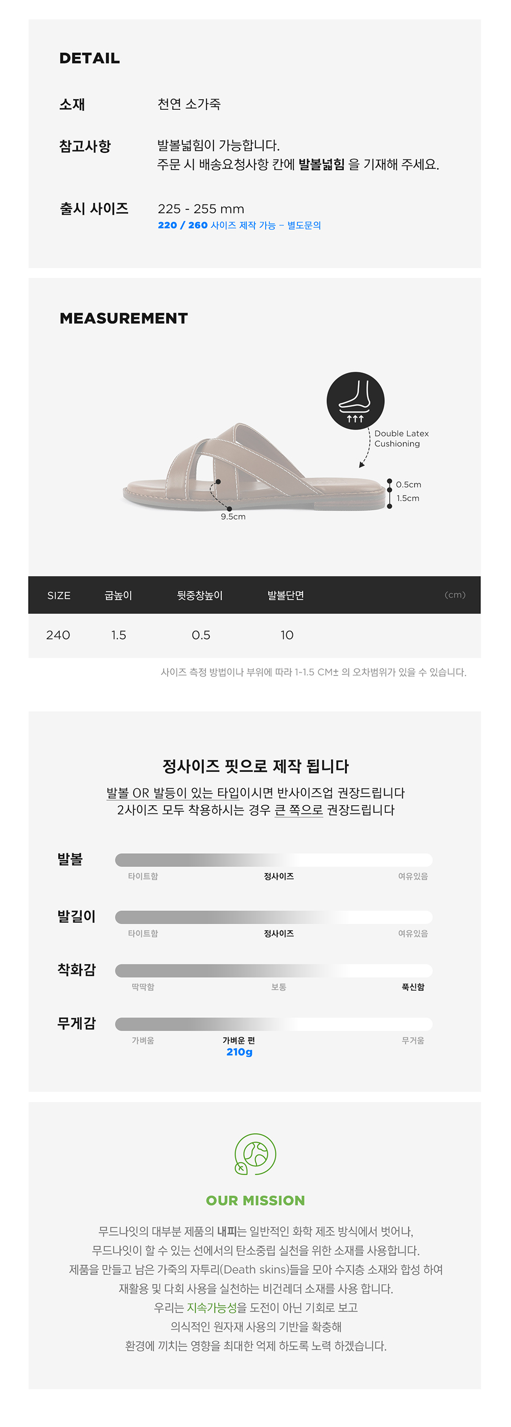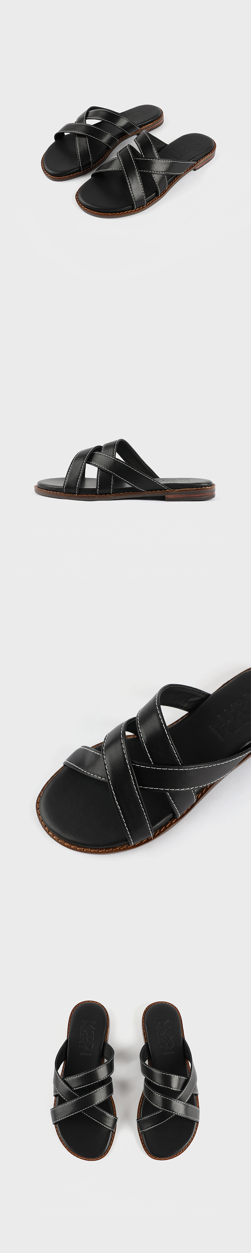 - 쉽게, 자주, 많이 신을 수 있는 데일리한 슬라이드 샌들 - 안정감있는 라운드 쉐입으로 다양한 발의 타입을 커버 - 사선으로 교차하는 유니크한 스티치 포인트 스트랩 - 유연하고 부드러운 라텍스 쿠셔닝으로 활동적이고 편안한 착화감