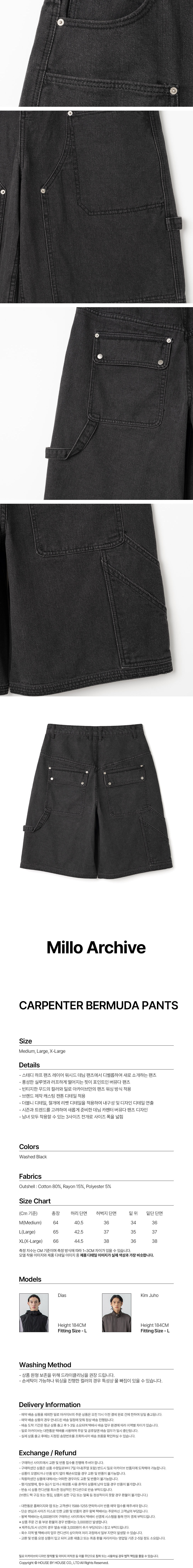 - 스테디 하프 팬츠 레이어 워시드 데님 팬츠에서 디벨롭하여 새로 소개하는 팬츠 - 풍성한 실루엣과 러프하게 떨어지는 핏이 포인트인 버뮤다 팬츠 - 빈티지한 무드의 컬러와 밀로 아카이브만의 팬츠 워싱 방식 적용 - 자체 제작 캐스팅 캔톤 디테일 적용 - 더블니와 절개에 리벳 디테일 적용하여 내구성 및 디자인성 강화 - 시즌과 트랜드를 고려하여 새롭게 준비한 데님 카펜터 버뮤다 팬츠 디자인 - 남녀 모두 착용할 수 있는 3사이즈 전개로 사이즈 폭을 넓힘