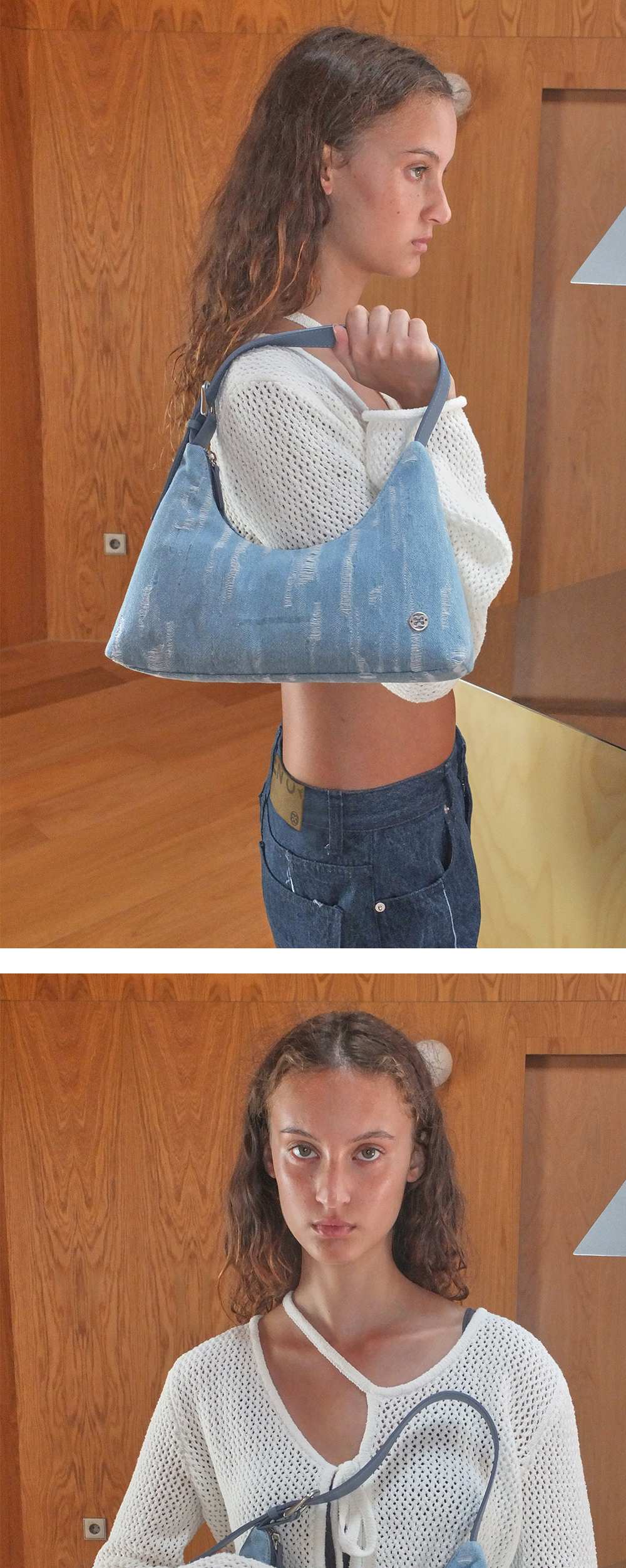 - 불규칙한 디스트로이드 데님 원단을 사용하여 빈티지한 무드가 돋보이며 이번 시즌 컨셉을 가장 명확하게 보여주는 아이템입니다. - 가방 밑창을 힘 있게 보강하여 실루엣이 무너지지 않고 사각형태를 그대로 유지합니다. - 소가죽의 숄더 스트랩으로 길이 조정이 가능하며, 컬러를 통일하여 깔끔한 디자인을 완성했습니다. - 니켈 샤이닝 지퍼와 하단 심볼 금속 라벨로 완성도를 높였으며 이너 포켓에 지퍼 여밈을 추가하여 실용성도 높였습니다.