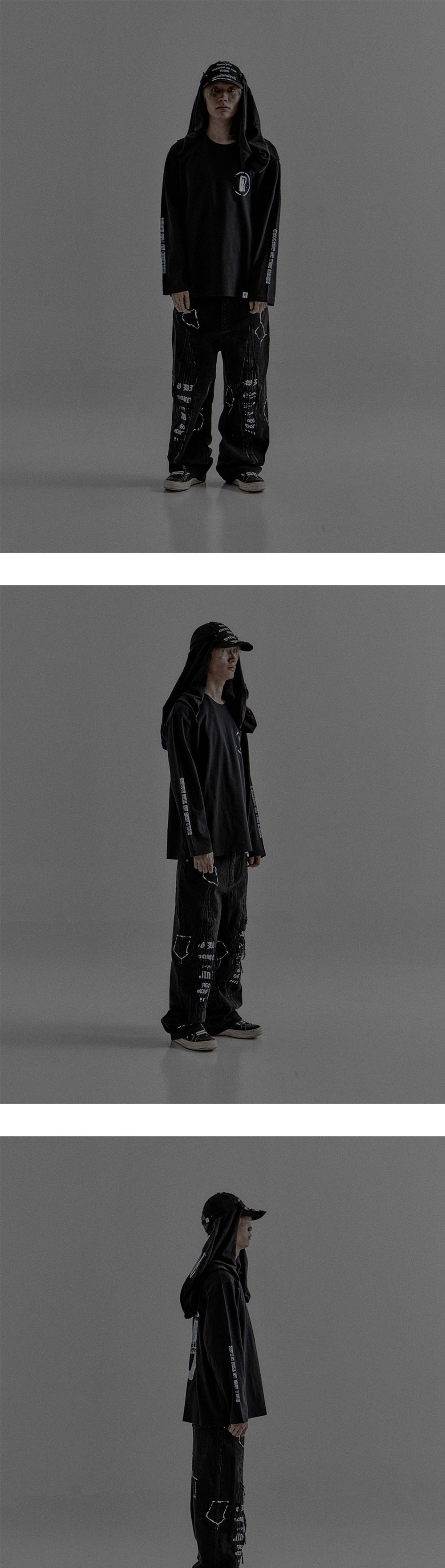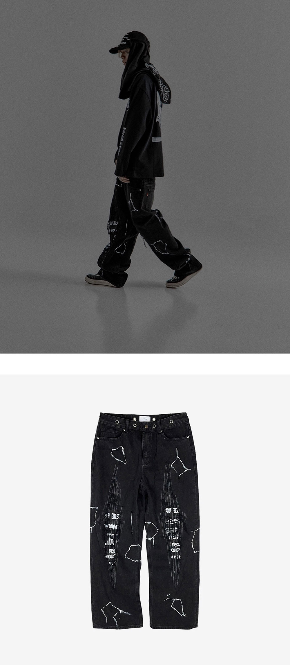 레저렉션13 보로 & 프린팅 디테일 데님 팬츠 블랙