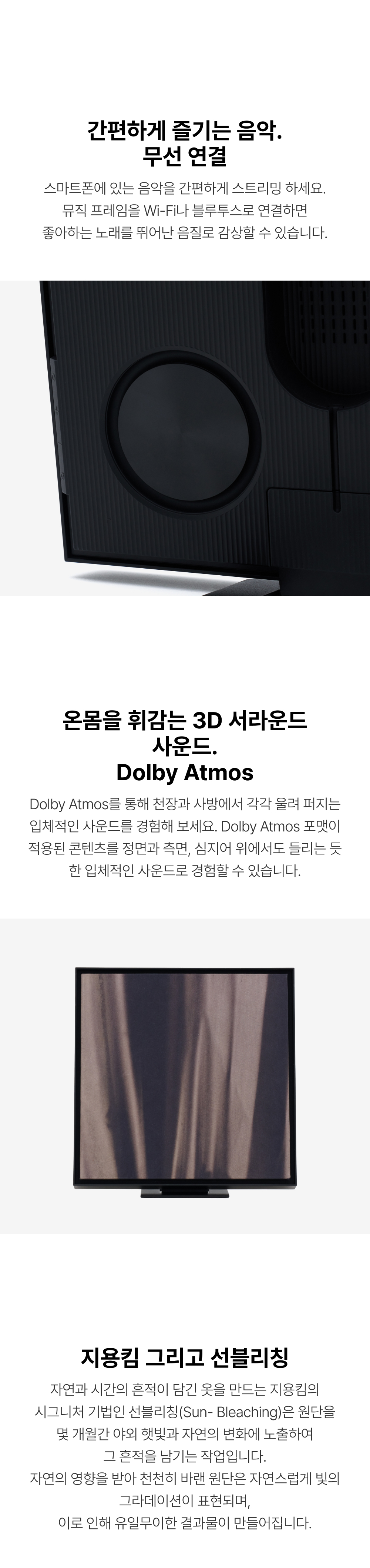 [배송 일정] 해당 상품은 6/7(금)부터 순차 출고 예정입니다. [주요 사양] -일반 : 채널 수 2.0 / 스피커 수 6 -액세서리 : 리모컨 없음 / 벽걸이 키트 있음 -음성 인식 기능 : 구글 호환 지원 -오디오 : 하이레스 오디오 디코딩 있음 /음성 강화 모드 있음 / 돌비 ATMOS Music,ATMOS,Dolby Digital Plus / LPCM (PCM 지원여부) 2채널 / 사운드 모드 Adaptive,Music,Standard / 야간 모드 있음 -비디오 피쳐 : 4K 영상 출력 없음 -연결 및 네트워크 : HDMI 출력 없음 / HDMI 입력 없음 / One Control 있음 / HDMI-CEC 없음 / USB 음악 재생 없음 / 블루투스 있음 / 블루투스 코덱 SBC / Wi-Fi 있음
