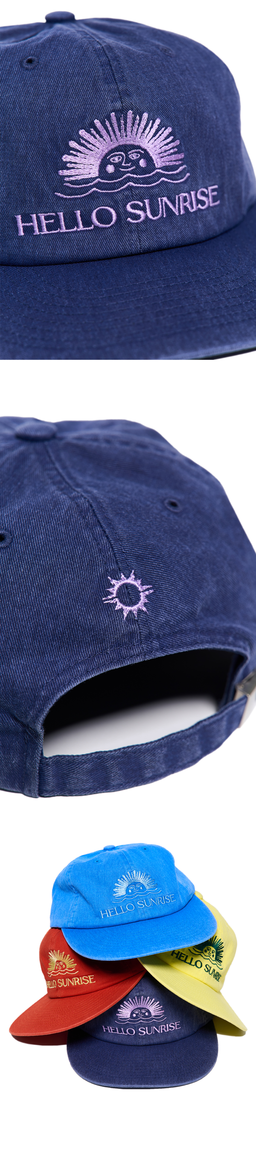 헬로선라이즈 오리지널 로고 그래픽이 자수로 들어간 6패널 캡입니다. - 워싱 가공으로 빈티지한 무드 - 뒤판 Hello Sunrise 심볼 자수 처리 *모자의 챙을 개인적인 취향에 따라 원하시는 각도로 구부려 착용하시길 권장 드립니다. *가먼트 워싱 과정 상 이염이 있을 수 있으며, 이는 자연스러운 현상이므로 구매 전 참고하시기 바랍니다. * Cotton 100% Made in Korea