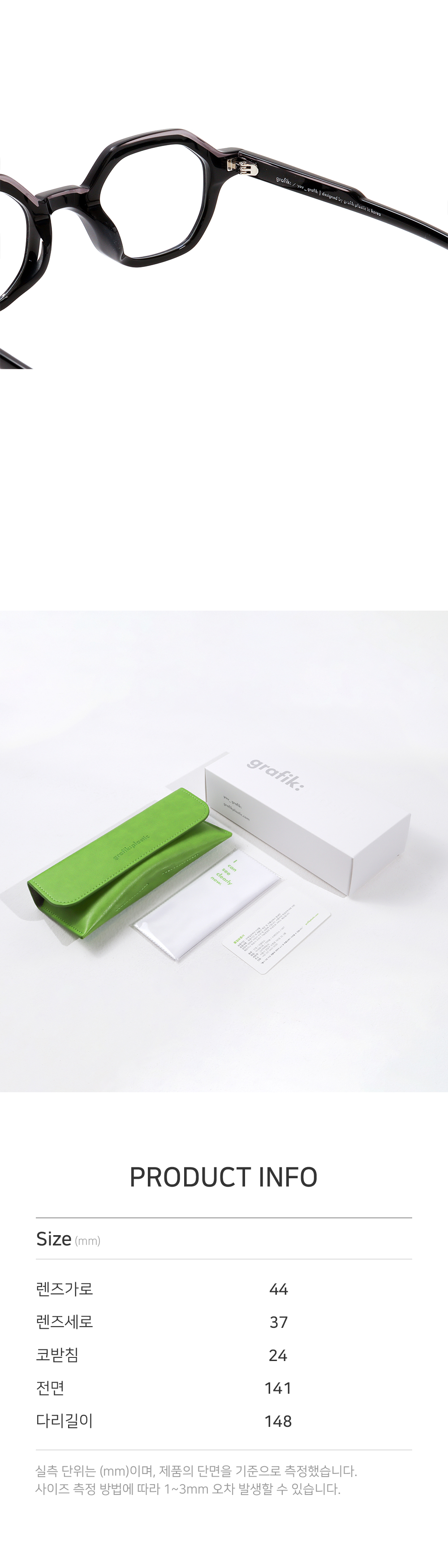 *안경테에 장착되어있는 렌즈는 프레임의 형태의 변형을 막기 위한 플라스틱 데모렌즈입니다.
