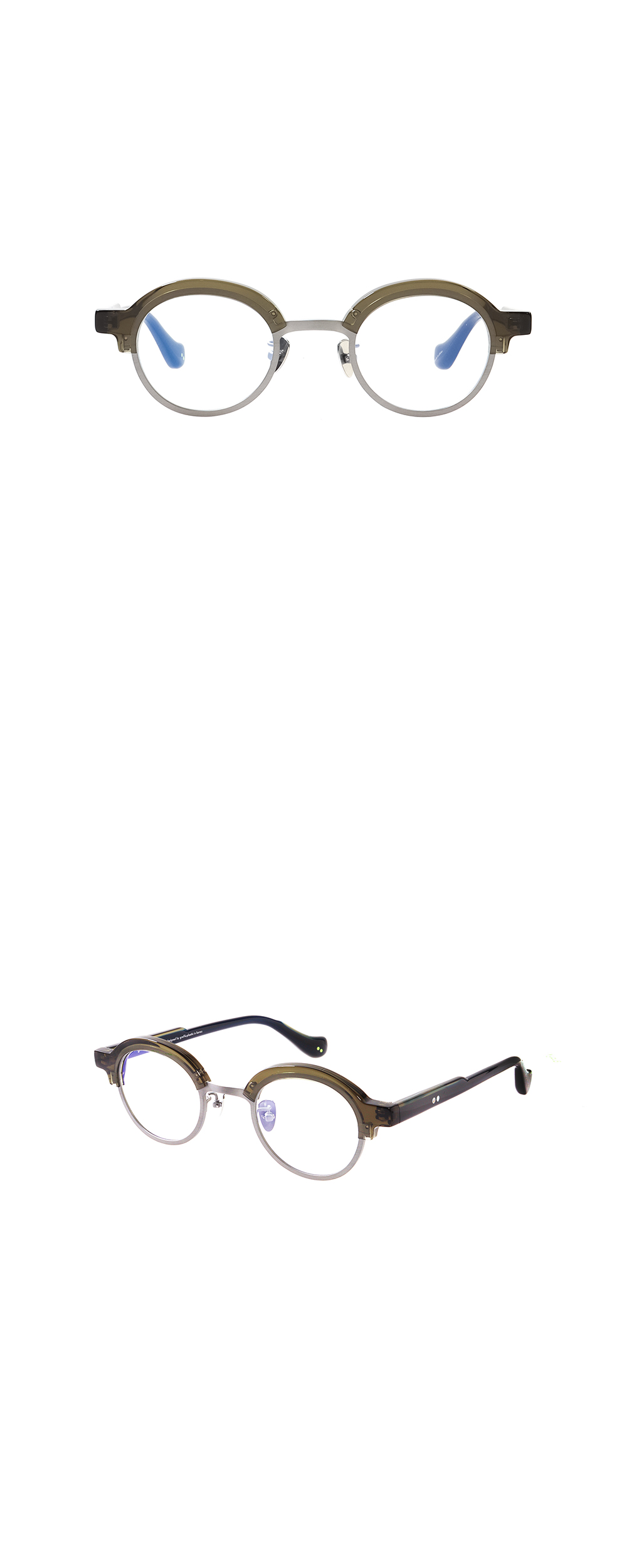 두께감있는 티탄소재의 림이 포인트인 모델입니다. 하금테면 블랙에 실버라는 공식을 깬 컬러베리에이션이 돋보이는 모델입니다. 무광의 실버프레임과 짙은 카키컬러의 상단부, 그리고 다리는 네이비로 매치하였습니다.